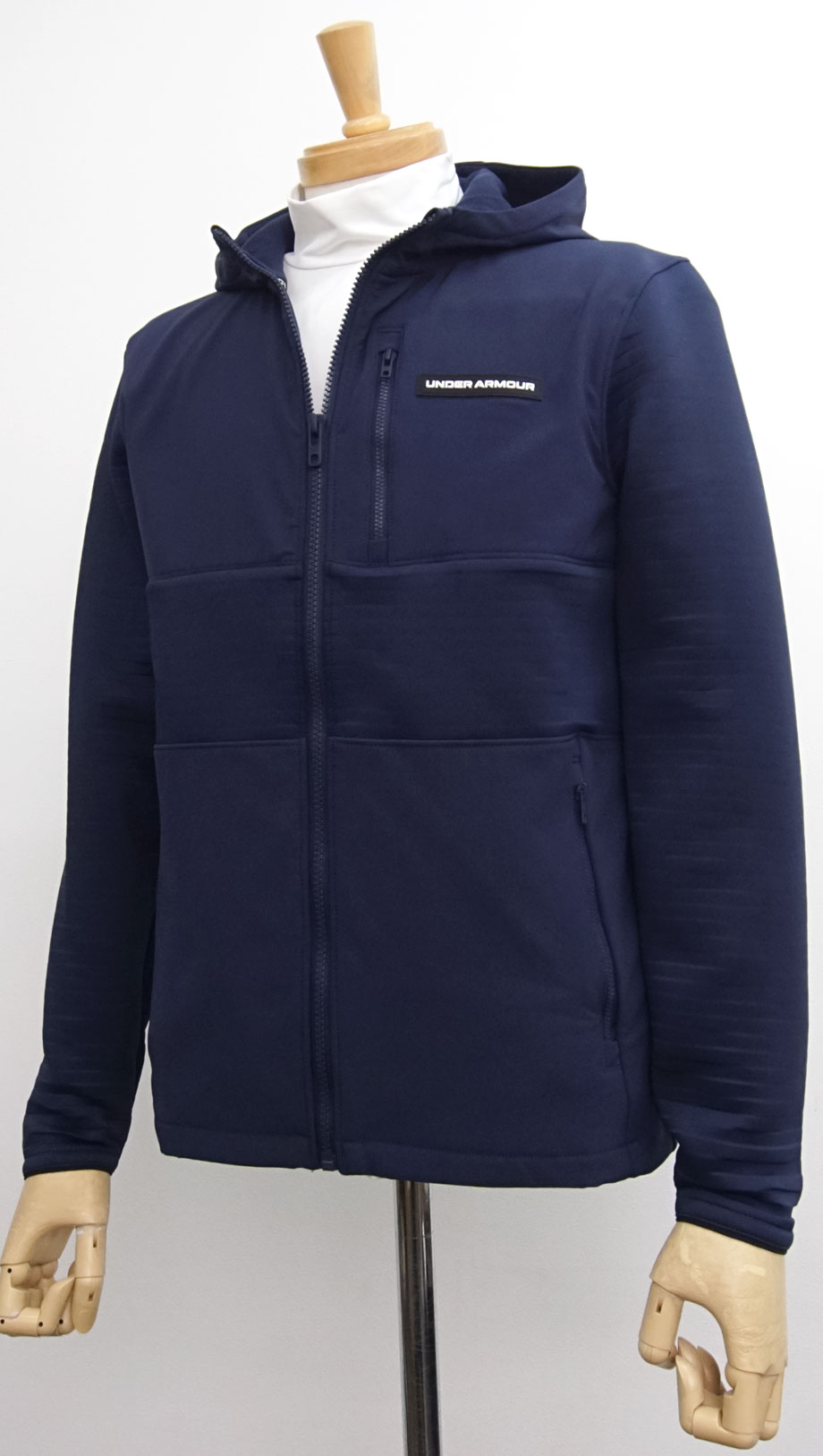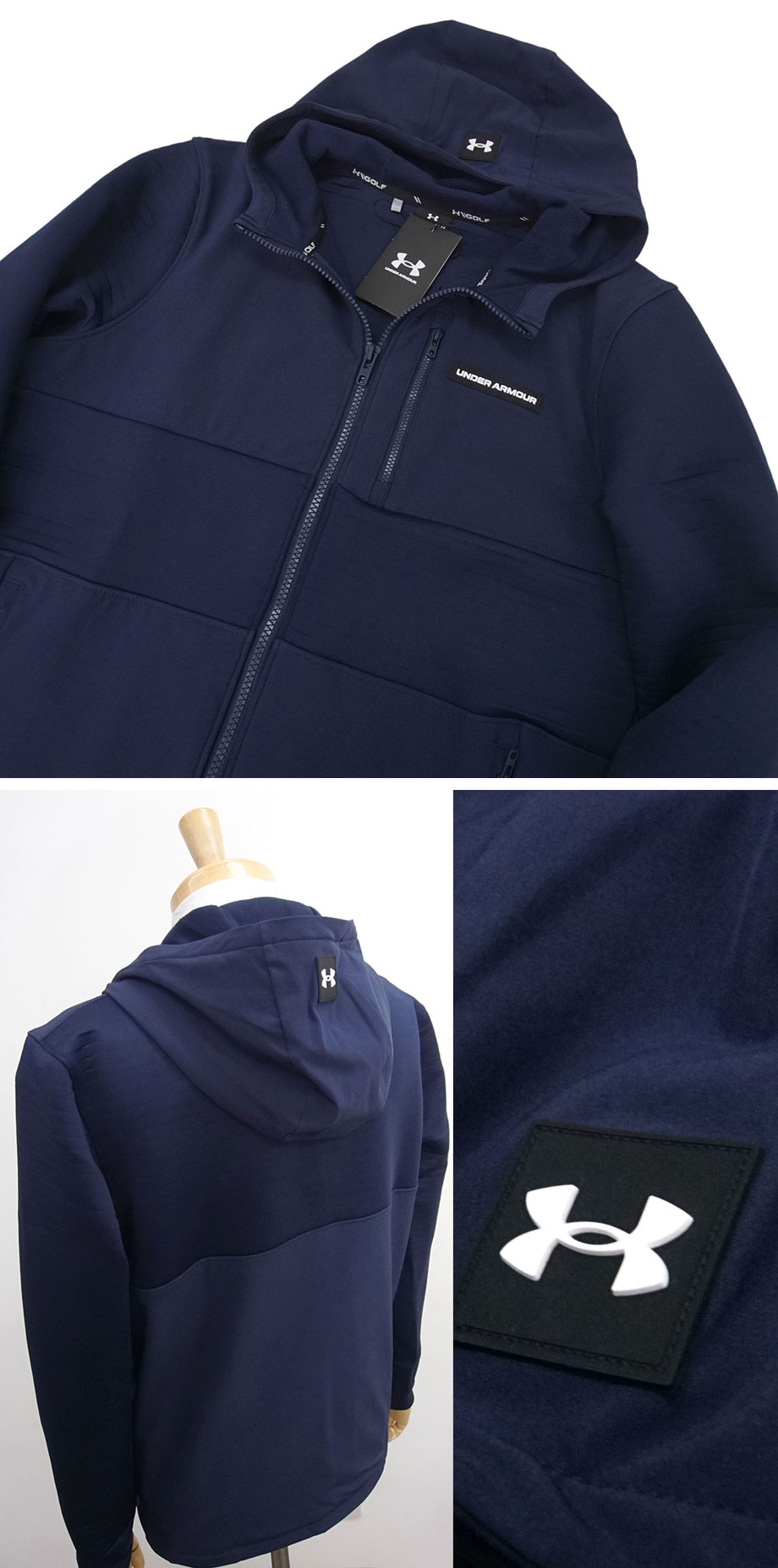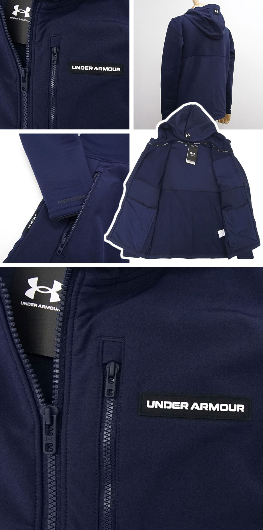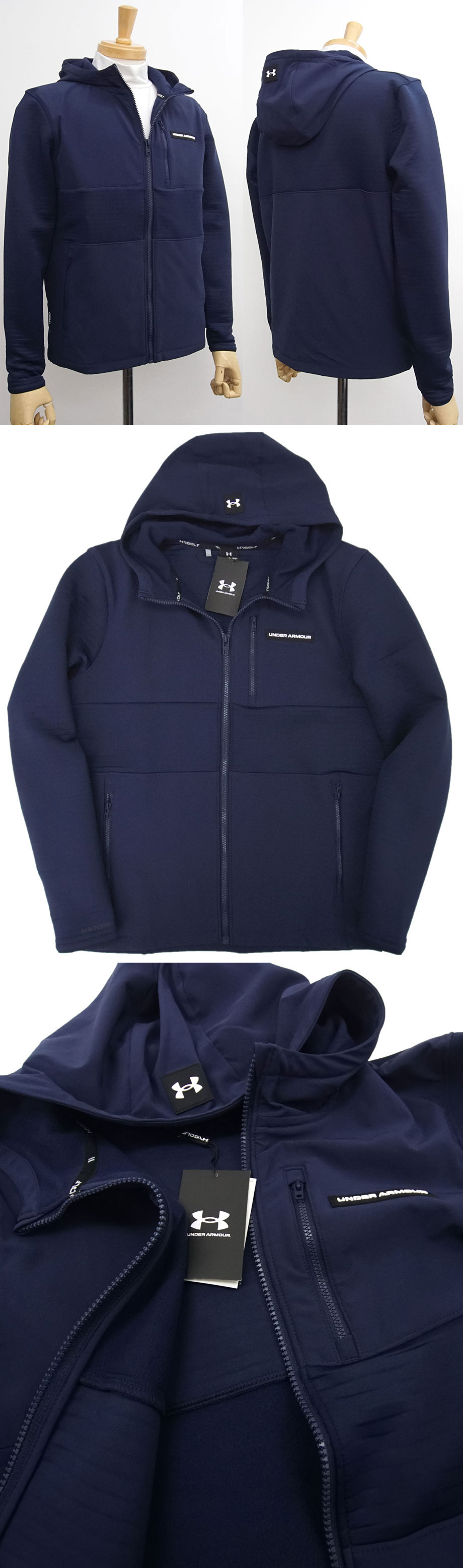 国内正規品です(アンダーアーマー日本総代理店 株式会社ドーム/MADE IN INDONESIA)。ありえませんが、万が一、偽物と判断されるようならば全額、返金させていただきますので、安心してご入札ください。(インナーのモックネックは撮影時のイメージでジャケットのみの出品です。)