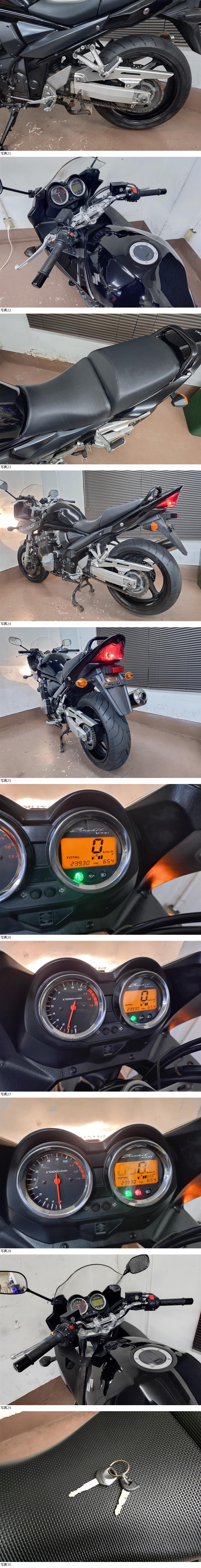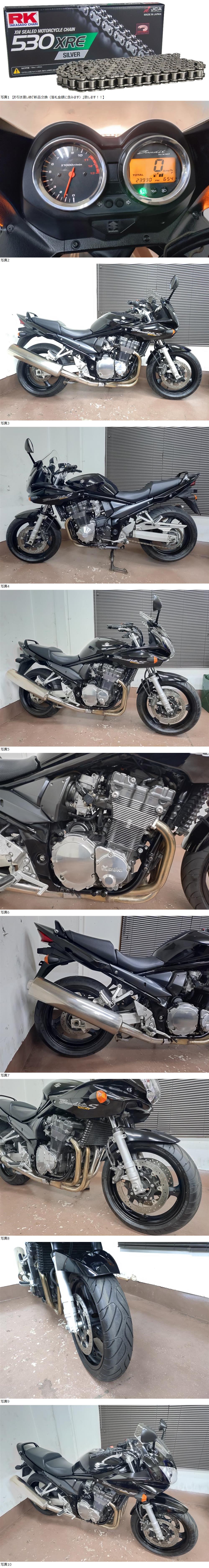 | 商品説明 | ★☆出品車両の拡大画像は冒頭または文末に掲載しております★☆ アクセス頂き有難うございます。 商品説明文を最後までご熟読頂き、オークションへのご参加およびお取引を、宜しくお願い申し上げます。 -------------------- ●車両基本情報 ・初年度登録年月:平成18年6月 ・型式:BC-GV79A 【2006年ファイナルモデル/コード:GSF1200SK6】 ・車台番号:GV79A-100***(下3桁伏字) ・メーター表示距離:23,930km(実走行距離) 過去記載距離 21,400km/令和6年 18,600㎞/令和4年 ・キー:純正共通1本+社外メットキー1本 ・エンジン始動:○ ・セルまたはキックスタート:○ ・バッテリー残量:○ ●【当方にて『走行テスト』実施済み】 ⇒正常制動・正常ミッション入力ほか確認済み ●保安部品の作動状態 ・ヘッドライトHI/LOW切替:○ ・ウインカー:○ ・ホーン:○ ・テールランプ:○ ・ブレーキランプ前後:○ ●ガソリンタンク内部の状態:目立つような内部サビは特に無し ●エンジンの状態 ・エンジン総合状態:年式/距離相応の状況 (特に大きな問題の無い一般中古車レベル) ⇒気になる際は必ず『現車確認』をお願い致します。 ・オイル漏れ箇所:- ・その他特記事項:顕著なオイル漏れ箇所は特に無し ●足回りの状態 ・ステムベアリングの状態:現状は問題なし ・フロントフォーク:左側小滲み確認/ダストシールひび左右小程度 (⇒当方にて簡易的な目止め処理のみ実施) ・前後タイヤ残量:F 9分山 R 9分山 ⇒『前後タイヤほぼ新品(バリ山)状態!』 ~銘柄=2025年製造のダンロップ製ロードスマートⅢ~ ●外装の状態 ・ガソリンタンク凹み:目立つような凹み箇所は特に無し ・外観全体:基本的に年式相応とお考えください (多数の画像や始動確認動画の通りの一般的な実動中古車です) 【ドライブチェーン新品交換(落札金額に含む)にてのお引き渡し】 ⇒銘柄はRK530XRE SILVERチェーンとなります! 『前後タイヤはほぼ新品』 『フロントフォークは上記の通り』 左フロントウインカーボディ補修あり 左右アッパーカウルエッジ部小削れ+小ひび箇所確認 (⇒何れも遠目では目立たない程度のもの) エンジンペイント剥がれ箇所あり トップブリッジサビ小程度確認 その他常識範囲内の経年劣化箇所各所にあり ⇒①より詳細把握のための現車確認(※諸条件あり・下記参照※)につきましては、質問欄より打診をお願い申し上げます。 ●その他特記事項: 車検は令和8年8月まで残あり 修復歴無し(JABA管理システム上および当方現車確認による) ●お渡しする書類:あり (自動車検査証+自賠責保険証+譲渡証明書+ナンバープレート) ●その他情報 2006年(モデルコード:GSF1200SK6)ファイナルのバンディット1200Sが入荷しました。 『実走行=23,930㎞』にて、走行距離も浅めの部類となります。 車検はR8年8月まで残がございます。 -------------------- 今回サービス特典として、①画像の【RK 530XRE SILVERチェーン新品交換】+②エンジンオイル交換(ワコーズAA 15W-40)および、③スズキ純正シフトシャフトシール新品交換にてのお引き渡し(⇒全て『落札金額に含みます』)となります! ~その他『車体別オプションメンテナンスメニュー』は下記の通りです~ -------------------- また、お財布に割とダメージのある『前後タイヤもほぼ新品状態』です。 ほぼバリ山状態+2025年製造の新鮮なタイヤとなります。 (銘柄はダンロップ製ロードスマートⅢ/前後) 昨今、タイヤの価格高騰が非常に厳しい昨今となります… 従ってこのあたりの状況につきましては有効と認識しておりますので、情報追記しておきます。 現状、走る・曲がる・止まるという二輪車に於ける基本三要素につきましては、特段問題はございません。 また今回は春のツーリングシーズン突入前ということもあり、上記内容の『魅力的な一部メンテナンスメニュー実施=お値打ち的な内容によるお取引』となりますので、このあたりも含めご検討くださいませ。 -------------------- 【注意事項】 始動(確認)動画につきましては当面の間、『当方の考えの下、試験的にアップしない方向』を考えておりますので、その実情は現車確認にてご対応をお願い致します。 ⇒【始動の証明=タコメーター動作画像による客観的証明】 昨今、当オークション取引をはじめとする周辺事情の変化ほかにて、基本的には対面取引を主軸に置く方向としていくための措置となります。 従って、遠方からの取引の方はその特性を十二分にご理解のうえ、それに臨んでください。 -------------------- カスタム箇所は特になく、基本的にはノーマル車となります。 社外ヘルメットキーシリンダーのみ、左タンデムステップ付近に装着されています。 当モデルは、『1985年から約21年間製造された、スズキのお家芸・歴史ある油冷エンジンの最終形態(ファイナル)』です。 ファイナルエディション(=タンク上面の『ファイナル』ステッカー/ゴールドホイール+ABS装備)と併行して販売されたモデルとなりますが、当モデルは非ABSとなりますので、単純な旧来からの構造が逆に良いかと考えます。 いず