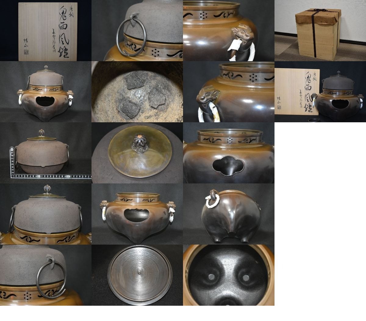 【光成】畠春斎釜・沢田博山合作「唐銅風炉・鬼面・切り合わせ釜」共箱・未使用