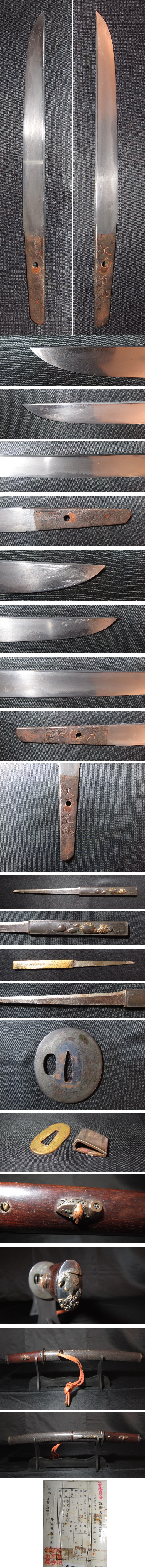 種類:短刀 あいくち 銘:「大慶直胤(たいけい なおたね)」 登録:静岡県68813 鑑定書:なし 刃長18㎝ 全長26.6㎝ 元幅2.1㎝ 元重0.6㎝ 先幅1.7㎝ 先重0.4㎝ 外装全長43.3㎝ ※中古品・時代物であることをご理解頂き、十分写真にてご検討の上ご入札下さい。 ◎発送は宅急便元払いを利用させて頂きます。 ◎運送中の破損が無いよう十分気を付けて梱包させていただきます。 ◎送料は大きさ・個数に関わらず、全国一律1,000円になります。 ◎次の地域は送料が変わります。 北海道1,500円・沖縄・離島2,000~3,000円 ◎複数個ご落札頂きましても、1個分の送料で結構です。 ◎小さな品物や割れ物以外の物は、定形外等の発送方法が可能です。お気軽にお問い合わせくださいませ。 ◎15時までにご入金を確認させて頂いたものについては、即日発送させて頂きます。15時以降のご入金分は翌日の発送になります。 ◎日・祝日の業務はお休みを頂いております。 | |||