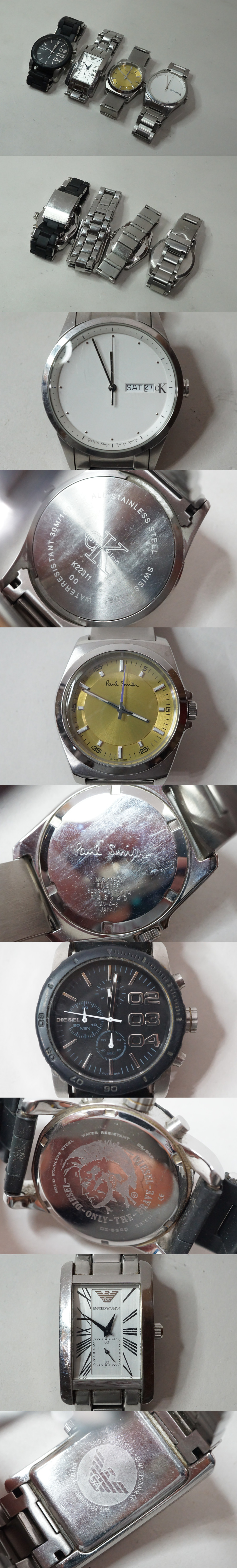 ☆商品詳細欄に追加画像ありブランド物 腕時計 まとめて4点 になります。不動品、経年なりの状態、当方詳しくありませんので詳しい確認等はしておりません。電池交換で稼働するかもしれません(確証はありません)。画像で分かる範囲での判断の上現状でお願いします。状態等は画像確認でわかる範囲で判断お願いします。支払は簡単決済のみ、発送はゆうパック元払いのみになります。ゆうパック60サイズでの発送になります。よろしくお願いします。