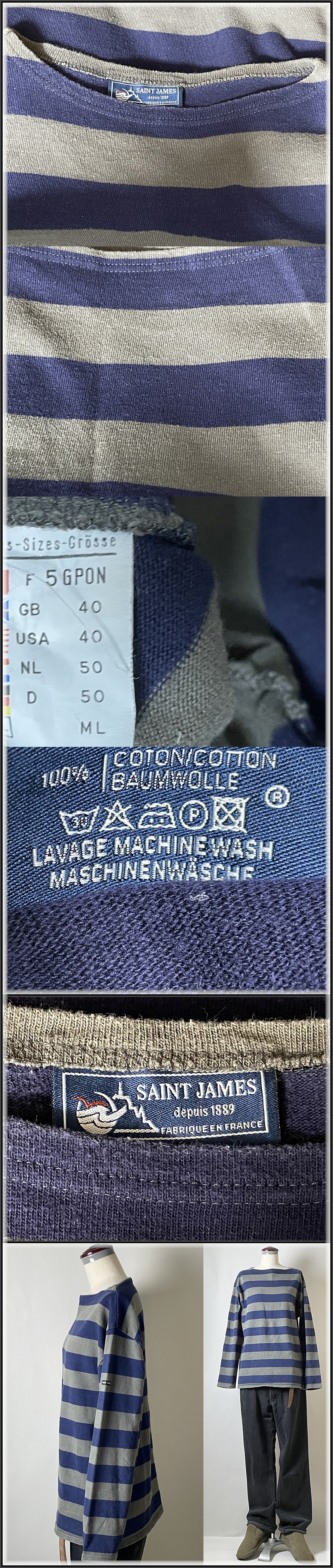 ★【並品 フランス製】SAINT JAMES セントジェームス やや厚手 ウエッソン 太 ボーダー バスクシャツ サイズ5 メンズ M~L程度 ネイビー系