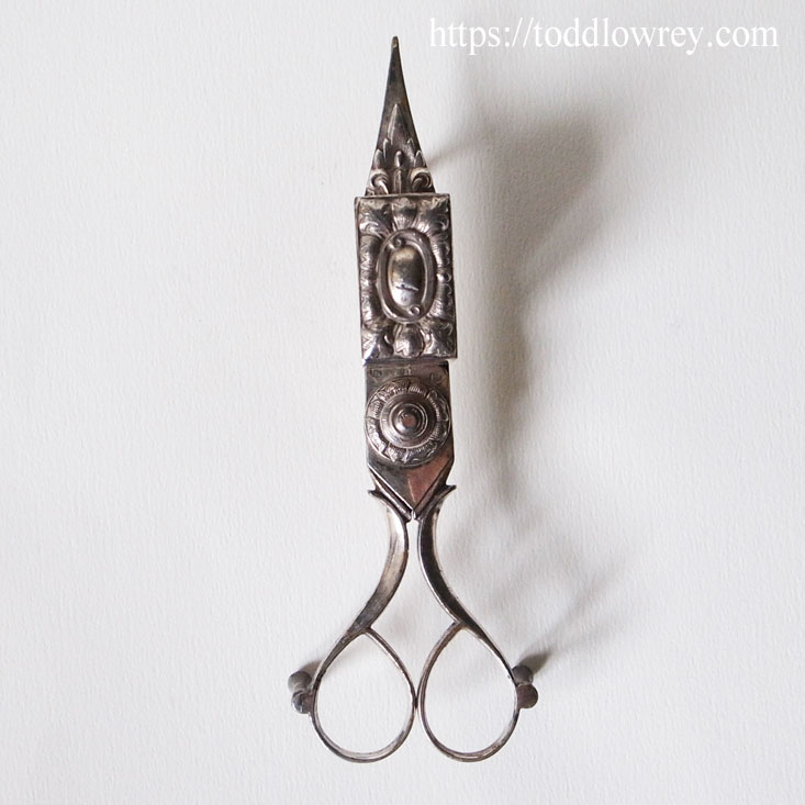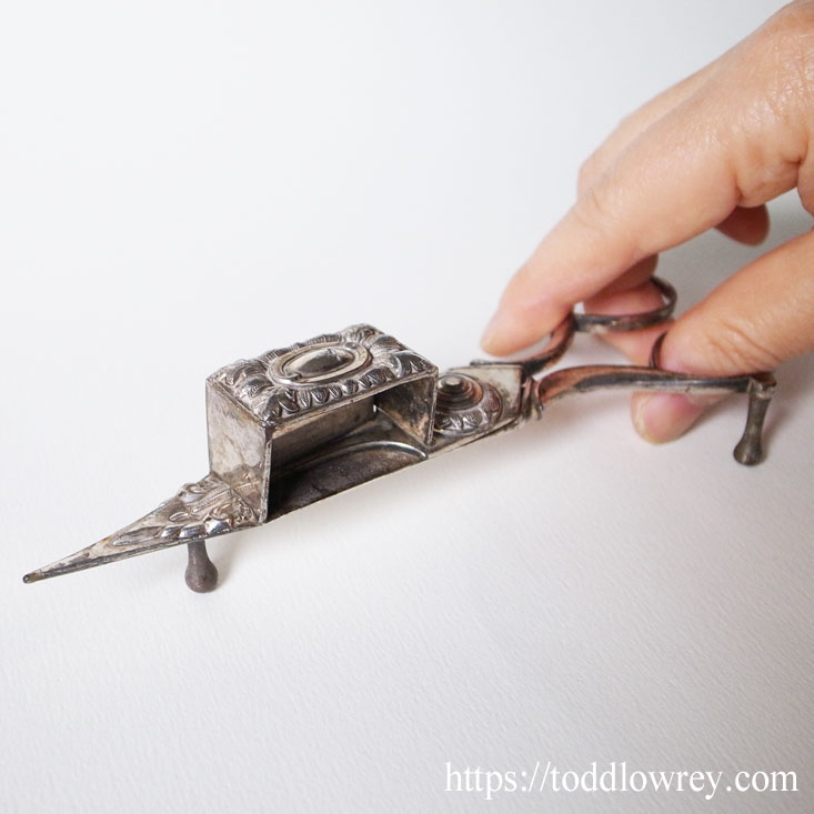 キャンドルスナッファーとは、ろうそくの火を消すための道具。 厳密にいえば、大きく2つの形状があります。 ひとつめは、ハサミ状の形で刃の部分に小さな箱がついているもの。 灯のともっているキャンドルの芯をハサミの要領でカットし消し、カットした芯は小箱に入り、次は新しい芯に火を灯すことができる、という仕掛け。 この仕掛けを考案したのは(パテントをとったのは)1776年英国にてChristopher Pinchbeckが行っています。 ふたつめが、長い柄の先にドーム状のものがついているもの。 灯のともっているキャンドルの先にぱかっとかぶせ、酸欠状態にして火を消します。こちらのほうは「candle extinguisher」「douter」などとも呼ばれます。 おそらくこちらのほうが歴史は古く、始まりははっきりしません。 息を吹きかけて消すと、煤がとんだりしがちであるところですが、このような道具を使えばそっと静かに火を消すことができます。 キャンドルが日々の暮らしに根付いている国だからこそ、ある道具といえるでしょう。 さて、今回ご紹介するのはは前者のタイプのキャンドルスナッファーです。 このタイプは「Candle Wick Snips」や 「Wick Trimmer」「Candle Trimmer」とも呼ばれます。(「wick」は芯、「snips」は切り取り、の意味) 作られた時代は古く、英国のディーラーによれば19世紀中頃、1850年代頃と思われ、仕上げは銀メッキであるとのこと。 確かにかなり古い印象ですが、それより昔のジョージアンとなるともっとシンプルなフォルムが主流でしたので、おそらくその頃のものであることは間違いないように思えます。 特に刻印はありませんが、私の経験としても銀メッキであると思いますので、そのようにご紹介させていただきます。 ヴィクトリア時代らしく、装飾は豊か。 花を思わせる放射状の飾りや、アカンサスの葉のようなモチーフが全体にバランスよく配されており、当時としてはなかなかの高級品であったことを伺わせます。 開閉部分はしっかりと可動しますので現在でも十分にキャンドルの炎を消すことができます。 ただ、実際に試してみましたが、正直「キャンドルの芯を切る」というよりは、「挟み込んで消す」という使い勝手でありましたので、どうかご了承をお願いいたします。 実際に火を消している様子をyoutubeにアップいたしましたので、よろしければご確認ください。 https://youtu.be/GD34OcZ3TzU *クリックするとヤフーのノーティスがでますが、そのままURLをクリックするとyoutubeの動画にリンクします。 ヴィクトリア時代から、このスナッファーはどれほど沢山のキャンドルの炎を消してきたのでしょうか。 これからは、貴方の手元で。 炎を消すたび、遥かヴィクトリアンの英国を感じてください。 ◆England ◆推定製造年代:c.1850年代頃 ◆素材:銀メッキ ◆サイズ:全長約16cm 幅約5.3cm 高さ約4cm ◆重量:91g ◆在庫数:1点のみ 【NOTE】 *古いお品物ですので、一部に小傷や汚れ、錆びや変色、歪み等がみられます。詳細は画像にてご確認ください。 *指を通す部分が、ぴたりとは合わず若干ずれています。置いたときのカタつきはございません。 *画像の備品は付属しません。 *上記ご了承の上、お求めください。 |