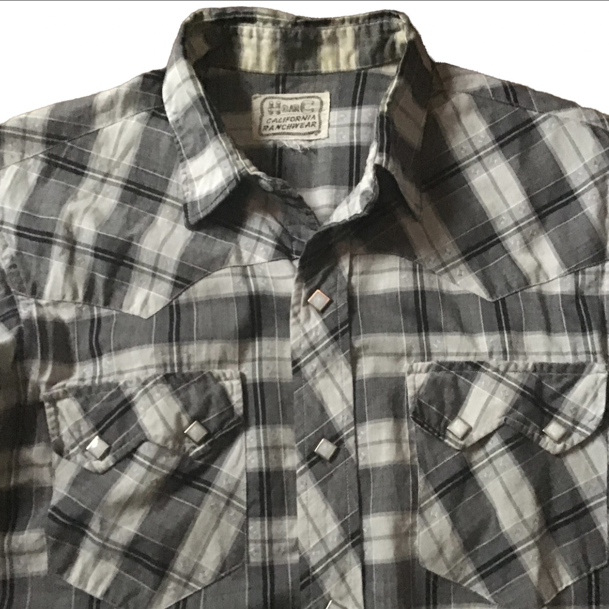 White x BLACK Shadow Dobby Plaid with Diamond Snap Western Shirt ■ 特筆ポイント 1950年代の『H bar C 』ロープタグ (MADE IN U.S.A.表記なし)が付くこのウエスタンシャツは、非常に珍しくヴィンテージ感が満載の凝った織りが特徴のWhite x Black/Grey シャドーのオンブレドビーで希少価値の高い固体になります。 ヴィンテージ・ドビー織機を使い凹凸のある菱形ドビー模様とドビーストラップが綿密に織り込まれたとてもクールなヴィンテージ・ファブリックとまず『H bar C 』では見ることのないソートゥース (Sawtooth)と言うノコギリ歯型形状ポケットとダイアモンドスナップが用いられたデザインはとても希少です。 ヴィンテージ・ブランドとして人気がある『H bar C 』ですが、1950年代までのアイテムは益々少なくなってきています。たとえ見つかったとしても、99%がクラシックな丸いスナップと三角形のフラップポケットが付いている固体か、レーヨン素材でスマイル型ポケットです。オンブレドビーファブリックとソートゥースのポケットデザインを用いたシャツはまず出てこないでしょう。またカジュアル好きには非常に気になる襟芯は入っていません。 ウエスタンシャツのスナップとフラップポケットは 、1946 年に『ROCKMOUNT RANCHWEAR』の創設した『Papa・Jack (パパジ ャック)』こと Jack A. Weil (ジャック アーノルド ワイル)によって考案されたものです。 50’s LEVI‘S サドルマンやショートホーンでも用いられたデザインですが、ヴィンテージのウエスタン・シャツに精通している方なご存知の特徴的なソートゥースのポケットデザインは『ROCKMOUNT RANCHWEAR』 がオリジナルで特許が取得されています。 貴重なBLACKシャドウのオンブレドビーは、刺繍やパイピングなどの入らないシンプルなミニマルデザインでグランジ的なロックテイストもありスタイリッシュです。多様なカジュアル・コーディネートがしやすく、長いシーズンで活用が出来るものです。またダメージのない極優良のヴィンテージ・コンディションですので長く愛用出来ます。 愛着のあるシャツですが、そろそろ整理が必要な時期時なり出品を決断しましたので価値観を共有できる方にお渡し出来ればと思います。 好条件が揃った激レアな『H bar C by California Ranchwear』ですので、ご興味がある方は、是非、この機会にご検討ください。 ■ コンディション ・個人所有 / 自宅保存 ・問題個所の無い極優良コンディションです。 ■ サイズ ・表記 : 欠損していますが、ネックサイズ 15-1/2 で間違いなく Medium になります。 ■ 採寸 (素人採寸・平置きになりますので多少の誤差は御了承下さい) ・身幅 : 約 51 cm ・着丈 : 約 73 cm ・袖丈 : 約 56 cm ・肩幅 : 約 45 cm ・裄丈 : 約 79 cm Terms and Policies (取引規約およびポリシー)