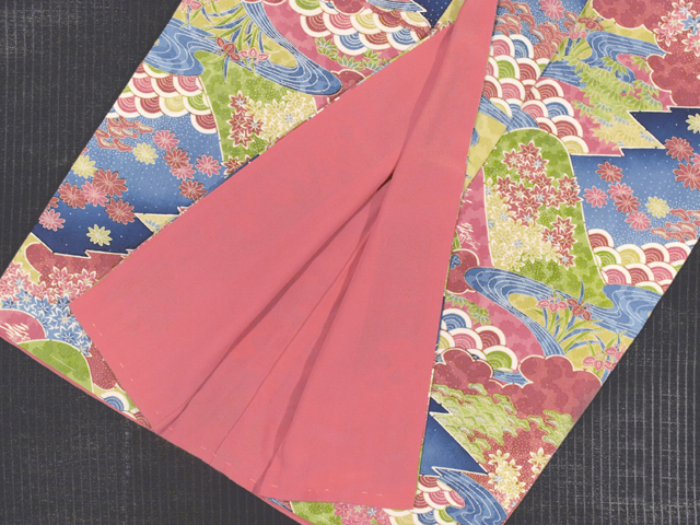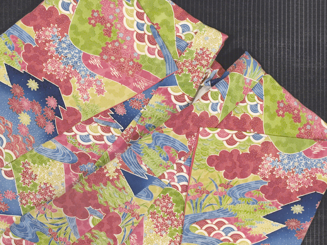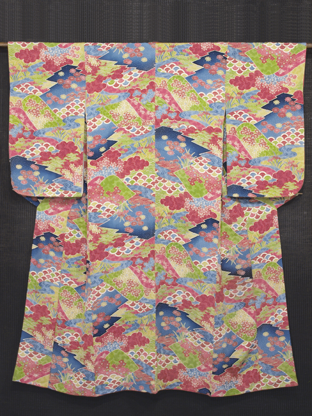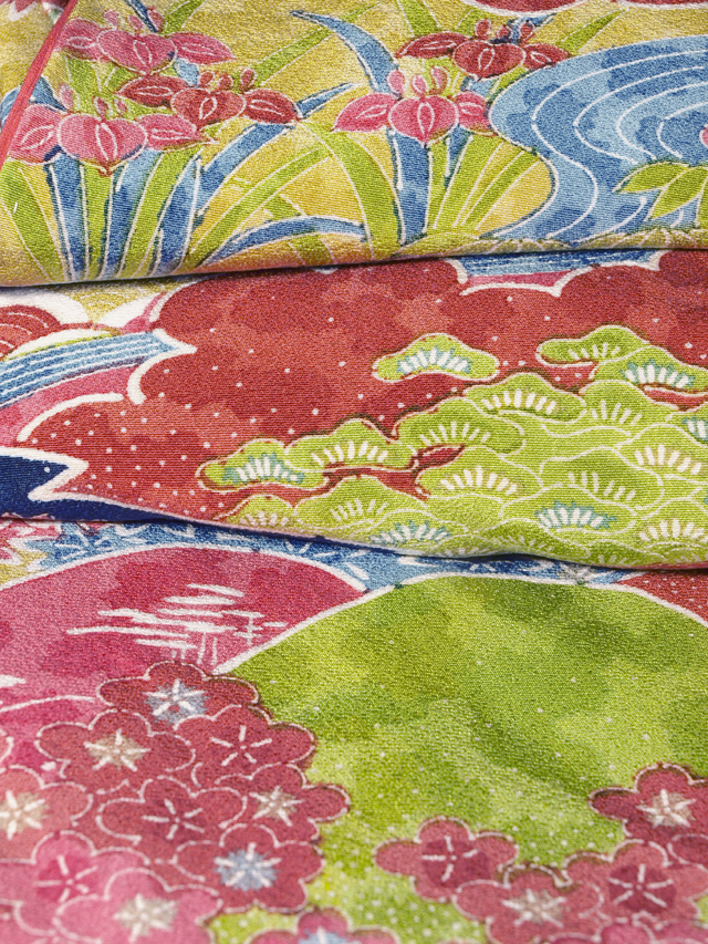 全体的な印象としては、濃淡のある萌黄(もえぎ)色、枯(か)れ色、藍(あい)色、紅色、赤色といった感じの地に、松皮菱と雲取りで、遠山と流水、草花の文様が型絵染めされている、一越縮緬の小振袖の小紋です。袷仕立てです。 とても華やかなかわいらしさのある意匠です。ややシボのこまかな縮緬地です。 しつけ付きの仕立て上がり未使用保管品で、目につくしみやよごれ、褪色などのダメージもなく、ほぼ新品同様にきれいな状態です。 |