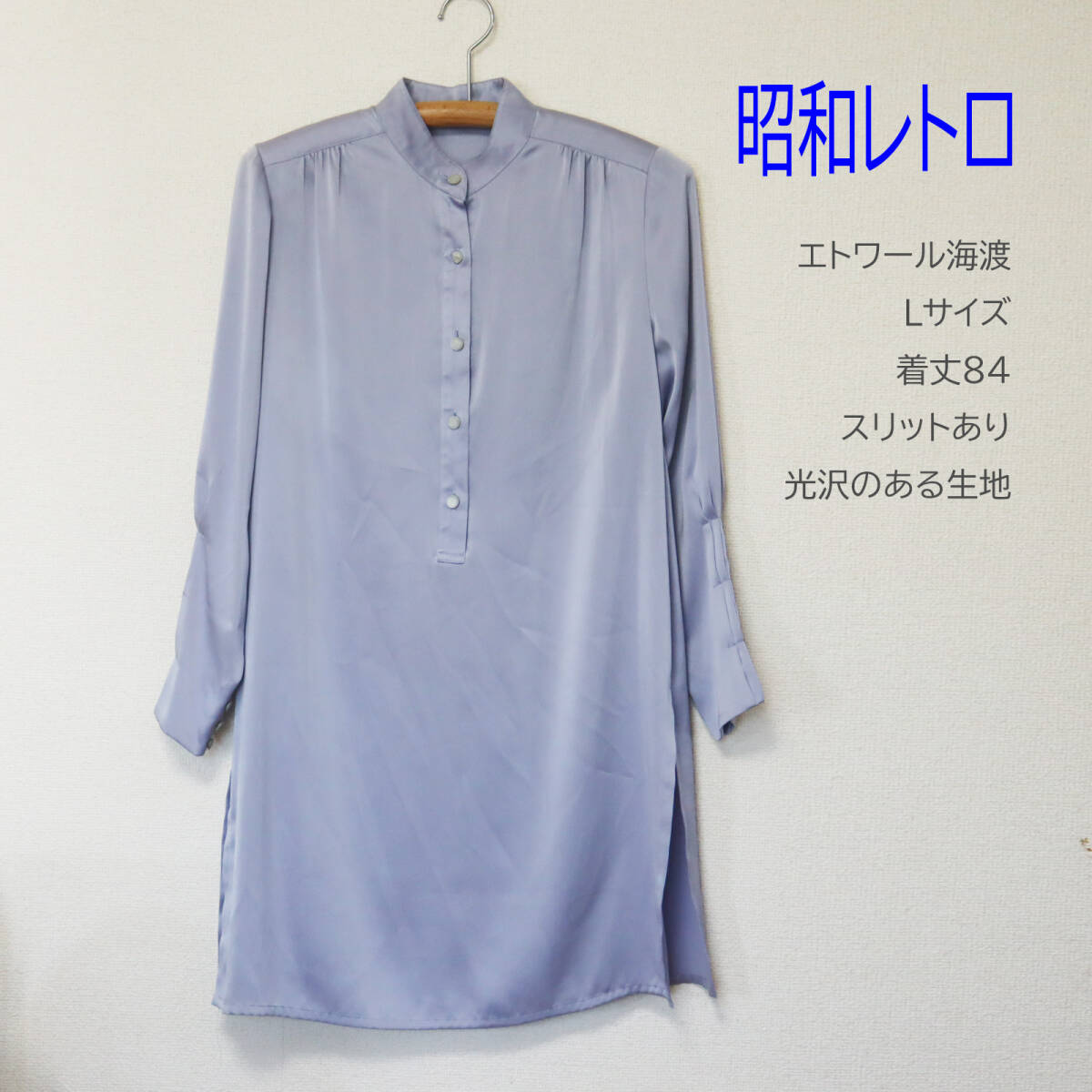 昭和レトロ ブラウス シンプルなデザイン 袖口にプリーツが寄せてあり、おしゃれです。 その分、袖(ヒジ下)が細くなっています。 スリットあり 光沢のあるサテンのような生地 ◆素材 :表記はありません。 おそらく ポリエステル。 ◆実寸:バスト104 肩幅37 着丈84 袖丈54
