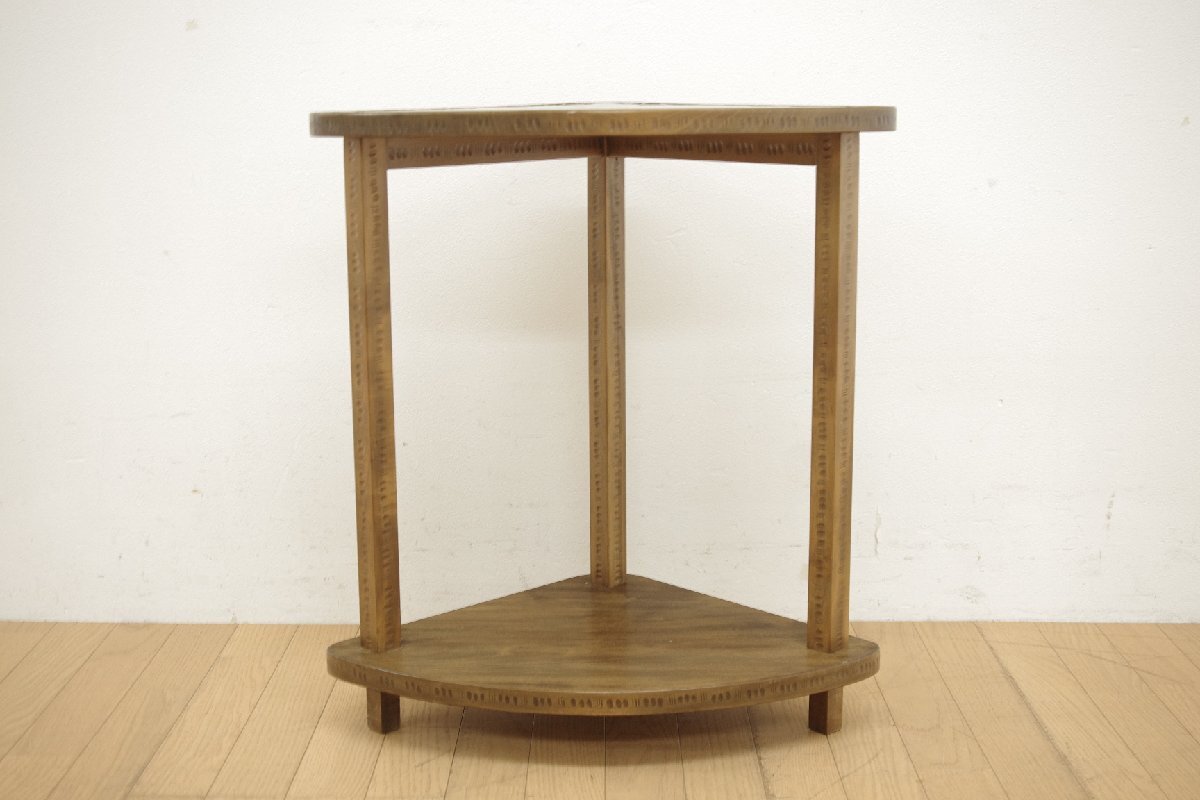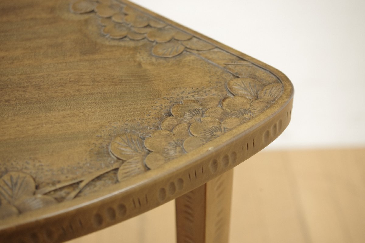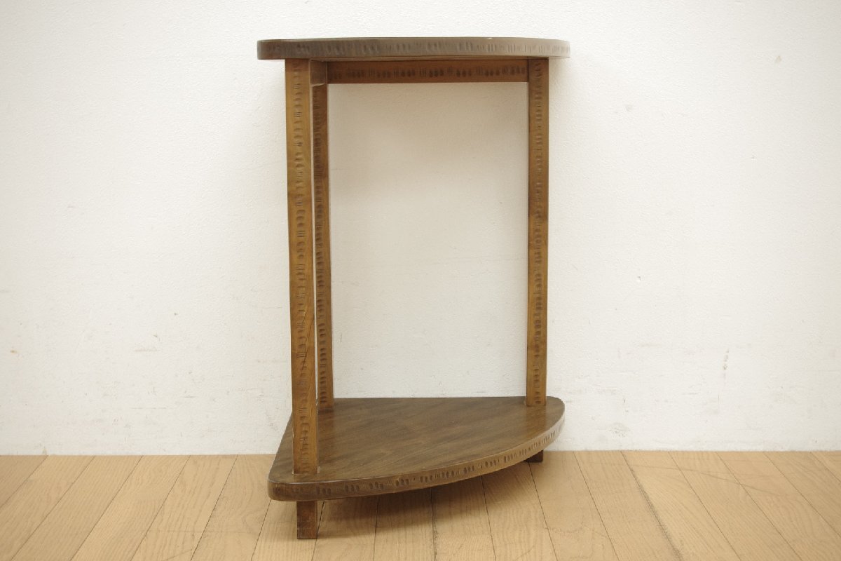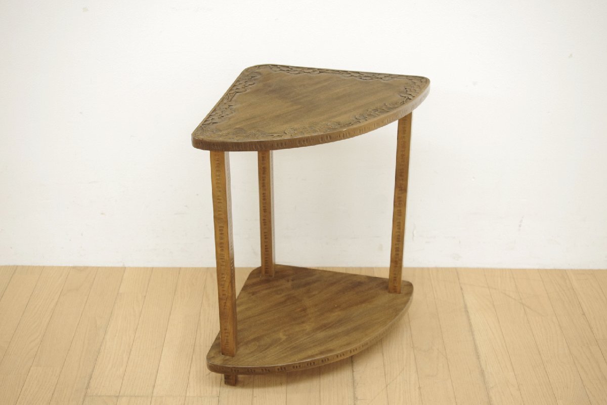 軽井沢彫 の コーナーラック のご紹介です。 軽井沢彫の始まりは明治中頃。日光彫の技法を習得した職人達により、日本らしいモチーフである松や竹、梅、牡丹、菖蒲、菊などから始まり、その後、欧米人の要望により桜の木や花、葡萄がモチーフに制作されるようになりました。 今回ご紹介のお品は、天板の縁に満開を思わせる桜が深彫りされ、さりげなく晴れ晴れしい雰囲気を味わえるお品。 側面や支柱には、淡い雰囲気で模様が施され、桜の木皮のようにも感じられます。 さりげなく、落ち着いた雰囲気の杢目が上質さを感じさせてくれるお品です。 便利に使っていただける小ぶりなラックとして、花台や飾り台として暮らしの中で楽しんでいただけるのではないでしょうか。 是非この機会にご検討くださいませ。 【コンディション】 使用品です。 ・天板には光の加減で見える線傷が多数、また側面や棚板には微細な打痕が見られます。 目立つようなダメージはなく、まだまだご愛用いただける状態です。 この他にも商品を多数出品しておりますので、こちらから御覧下さい。 | ||