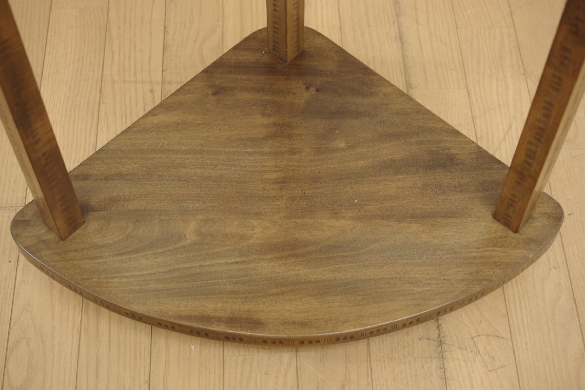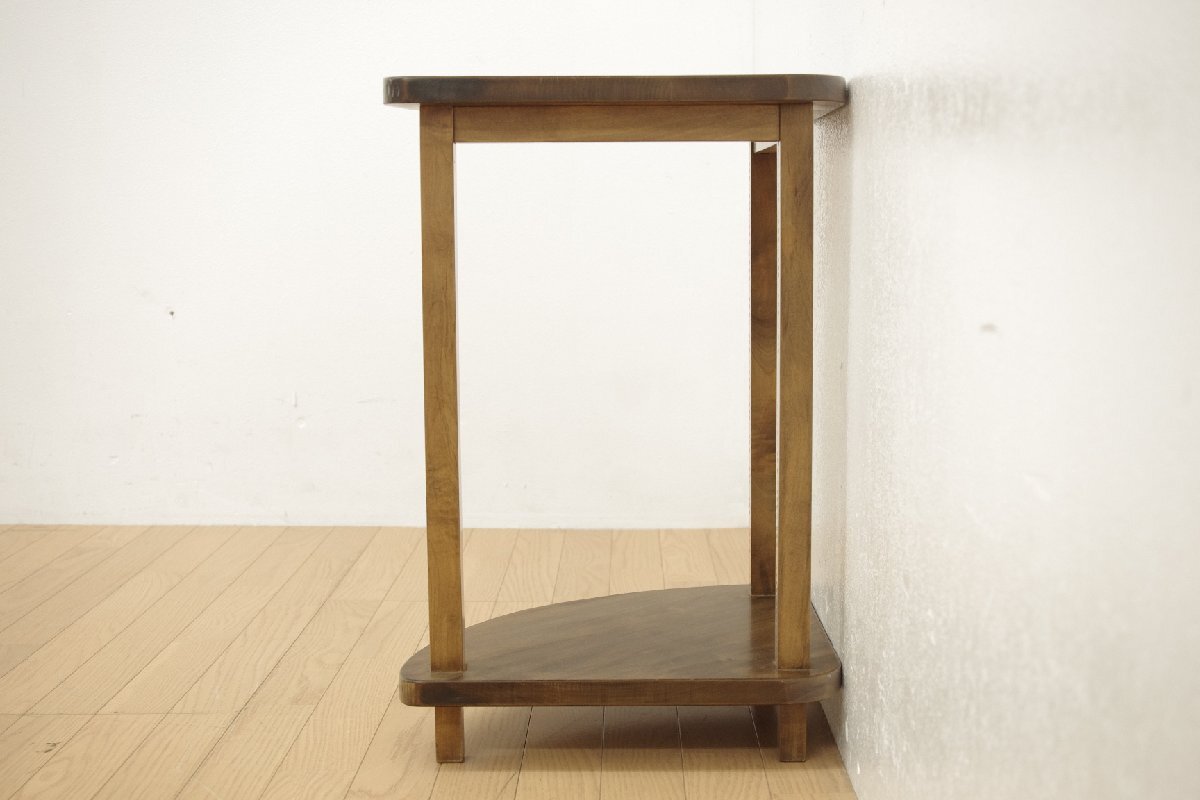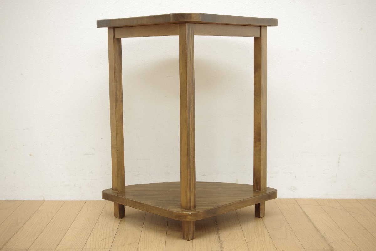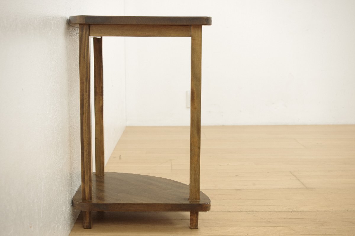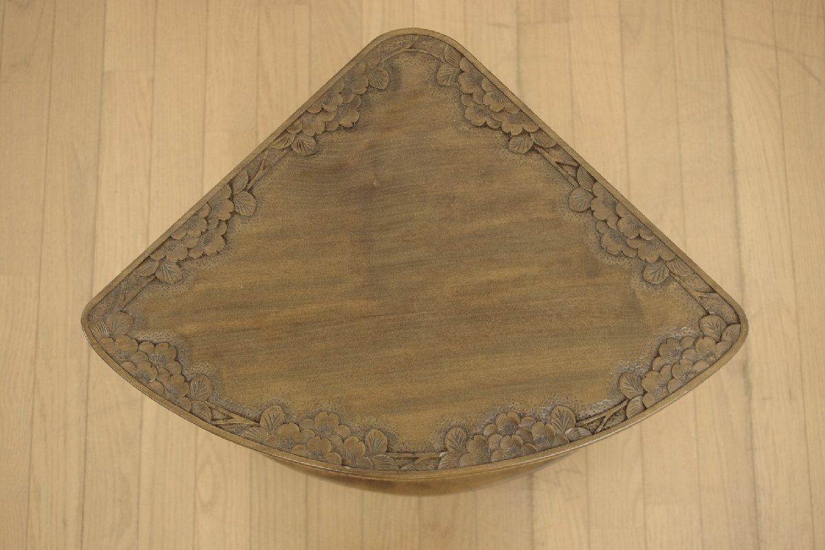 軽井沢彫 の コーナーラック のご紹介です。 軽井沢彫の始まりは明治中頃。日光彫の技法を習得した職人達により、日本らしいモチーフである松や竹、梅、牡丹、菖蒲、菊などから始まり、その後、欧米人の要望により桜の木や花、葡萄がモチーフに制作されるようになりました。 今回ご紹介のお品は、天板の縁に満開を思わせる桜が深彫りされ、さりげなく晴れ晴れしい雰囲気を味わえるお品。 側面や支柱には、淡い雰囲気で模様が施され、桜の木皮のようにも感じられます。 さりげなく、落ち着いた雰囲気の杢目が上質さを感じさせてくれるお品です。 便利に使っていただける小ぶりなラックとして、花台や飾り台として暮らしの中で楽しんでいただけるのではないでしょうか。 是非この機会にご検討くださいませ。 【コンディション】 使用品です。 ・天板には光の加減で見える線傷が多数、また側面や棚板には微細な打痕が見られます。 目立つようなダメージはなく、まだまだご愛用いただける状態です。 この他にも商品を多数出品しておりますので、こちらから御覧下さい。 | ||