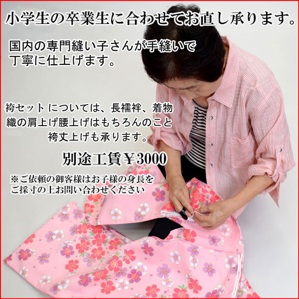 サイズ | ★着物は丈の短い袴専用着物です そのため、丈をたぐる必要がないので着付けが非常に楽です。 着物:身丈約110cm 袖丈76cm 裄丈68cm 袴:袴下91cm 適合身長:約153cm~160cm ※袴サイズを変更することで適合身長を変えることができます。 ◎袴下95cm(適合身長160cm~170cm)に変更可能です。 ◎袴下87cm(適合身長145cm~153cm)に変更可能です。 ◎袴下83cm(適合身長138cm~145cm)に変更可能です。 ★小学生の卒業生に合わせてお直し承ります。 ※ご依頼のお客様はお子様の身長をご採寸の上お問い合わせ下さい。 ※ご変更をご要望のお客様は、「フォーム備考欄」「メール(aji_net@khaki.plala.or.jp)」「お電話」 「FAX」いずれの方法でご連絡ください。 ※上記適合サイズ外の場合でも御相談承ります。 「サイト設置の質問」「メール(aji_net@khaki.plala.or.jp)」「お電話」「FAX」いずれかの方法で御相談ください |