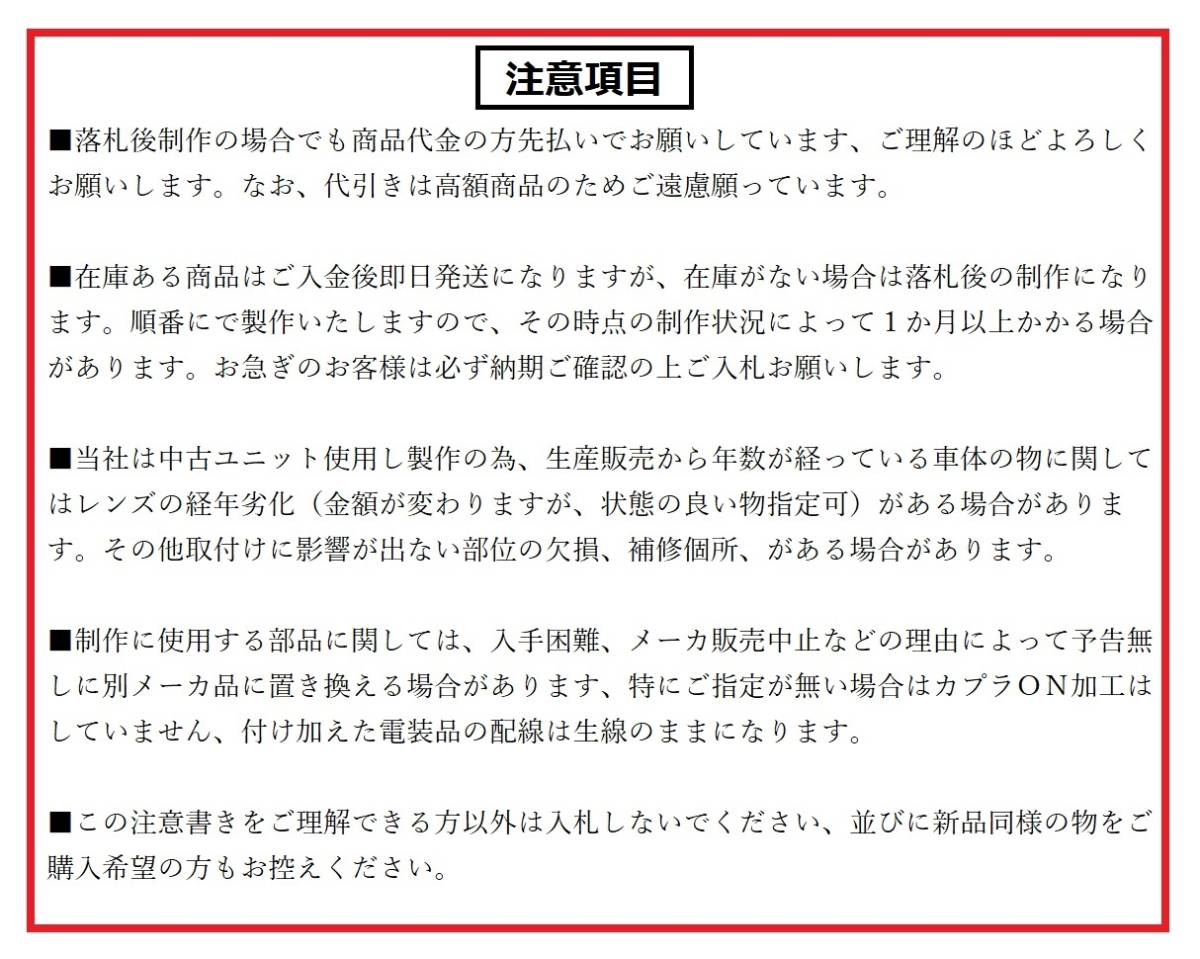■■★★必ずお読みの上入札してください★★■■ ■当社が製作に使用するベースライトは中古品再利用ですので、研磨作業はしていますが、どうしても使用感、小キズなどが残る場合がありますので、ご了承ください。 ■在庫ある商品はご入金後即日発送になりますが、在庫がない場合は落札後の制作になります。順番にで製作いたしますので、その時点の制作状況によって1か月以上かかる場合があります。お急ぎのお客様は必ず納期ご確認の上ご入札お願いします。 ■AFS機能付き(追加代金がかかります)モデルの場合は落札後に必ずご指定ください。特にご指定がない場合はAFSなしで製作になりますので、ご注意ください。 ■ベースに使う中古ライトは程度などの状態は、感じ方に相違が出る場合がございます。当社の商品説明にご了承いただけない場合は、ご購入をお控え下さい。 ■型式等は必ずご自身で最終確認された上でご購入下さい。また、ご不明な点、ご要望はがございましたら必ず落札後取引連絡欄にご明記の上ご指定ください。 ■中古ユニット使用のため取付けには影響が出ない部位の欠損がある場合があります。なお、補修し取り付けに問題ないように製作していますので、ご理解ください。 ■一点物の加工品のため返品・交換・保証などのサービスは承っておりません。 ■取付け工賃補償は行っておりません。出荷後は点灯不良、商品および車体側の不具合などいかなる事がおこりましても一切責任を負いかねます。万が一故障の際は有償で修理を承っております。 ■光軸調整で衝撃や回しすぎ等を含め、破損した場合の修理は有償となります。 ■落札後のトラブル防止のため、神経質な方のご入札、並びに新品お求めの方のご入札をお断りしています。 ■ご入札の前よく考えてからご入札してください。なお、質問があれば入札する前にお願いします。ノークレーム、ノーリタンでお願いします。 ■最近悪戯入札が横行していますので、新規ヤフーIDの方、評価が悪い方当方の判断で入札取り消す場合があります。 ■当方の製品は基本配線を繋ぐだけで作動するように制作していますが、取り付け作業はプロの方にお願いする事お勧めいたします。 ※レンズ内曇り防止のため、取り付け作業後必ず配線部分出口の防水作業をしてください。 |