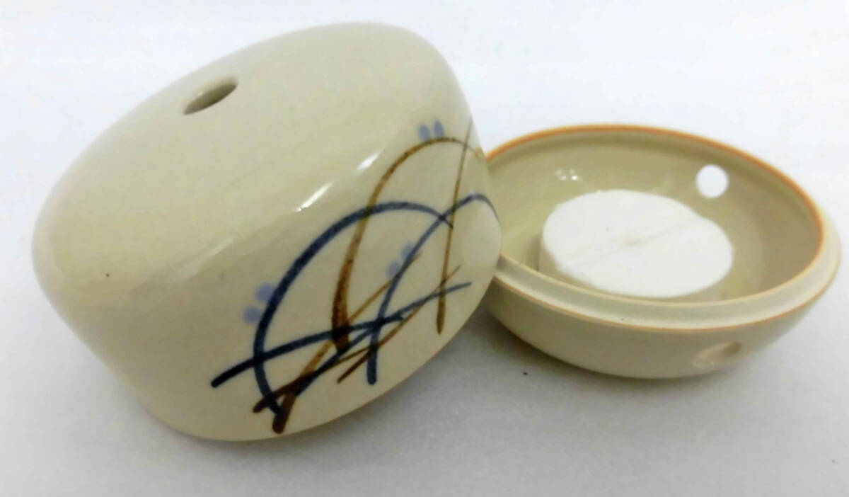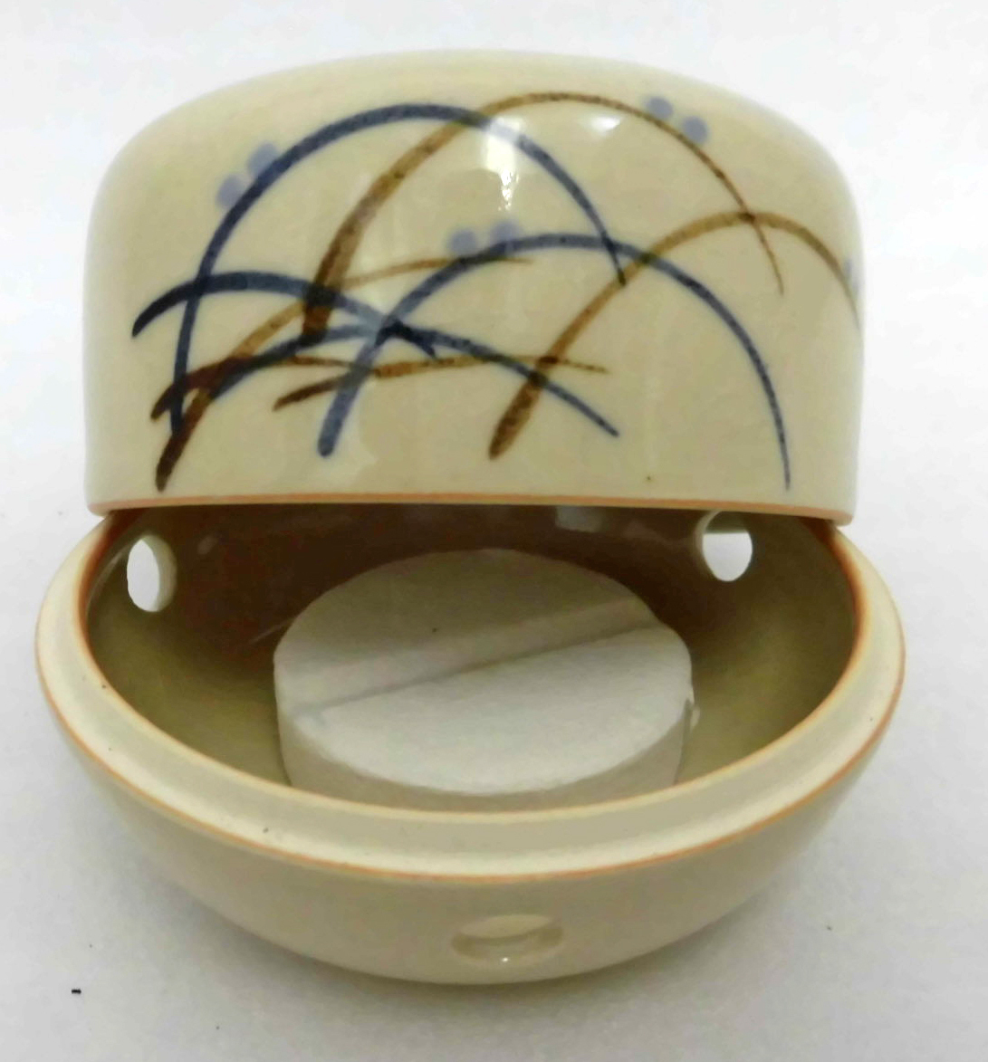 | 品名:京焼香炉 セミアンティーク 香道具 茶道具 煎茶道具 作家:鳩居堂 寸法:Φ約8.2㎝ 丈≒6.2㎝ 状態:白檀(若菜)渦線香付 セミアンティーク ・経年経過品です。 できるだけ説明いたしますが、写真でご判断ください。写真の色の誤差はご容赦ください 出品者の主観です:趣ある経年経過、希少品です。 | ||