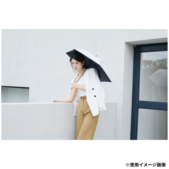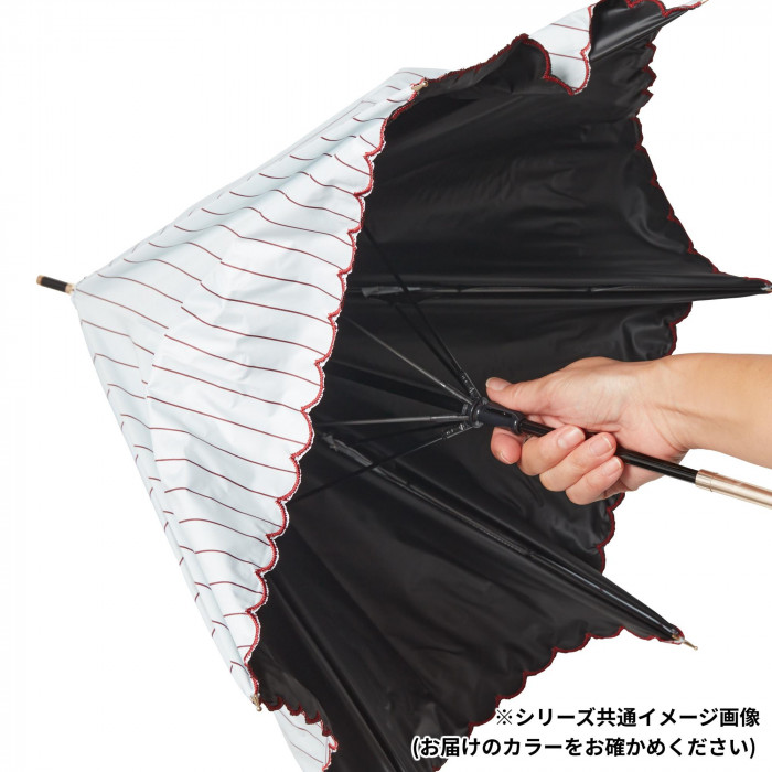 | 人ごみの中でも使いやすい大きさと軽さの傘。UVカット率99.9%、高い遮光・遮熱性。マルシェの屋根をイメージしたパターン。細いストライプと裾の刺繍が繊細でこだわりのあるデザインです。 |