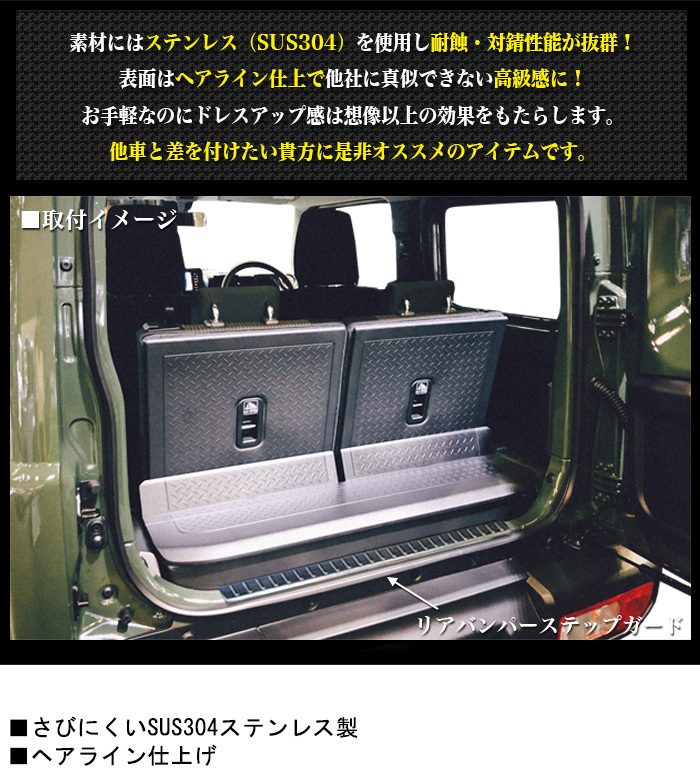 | ■適合 ・ジムニー JB64W H30.7〜 ・ジムニーシエラ JB74W H30.7〜 ■サビに強いSUS304 テンレス製&ヘアライン仕上げ ■3D立体プレス成型品 ■両面テープ装着済み ■セット内容:リアバンパーステップガード 1P |