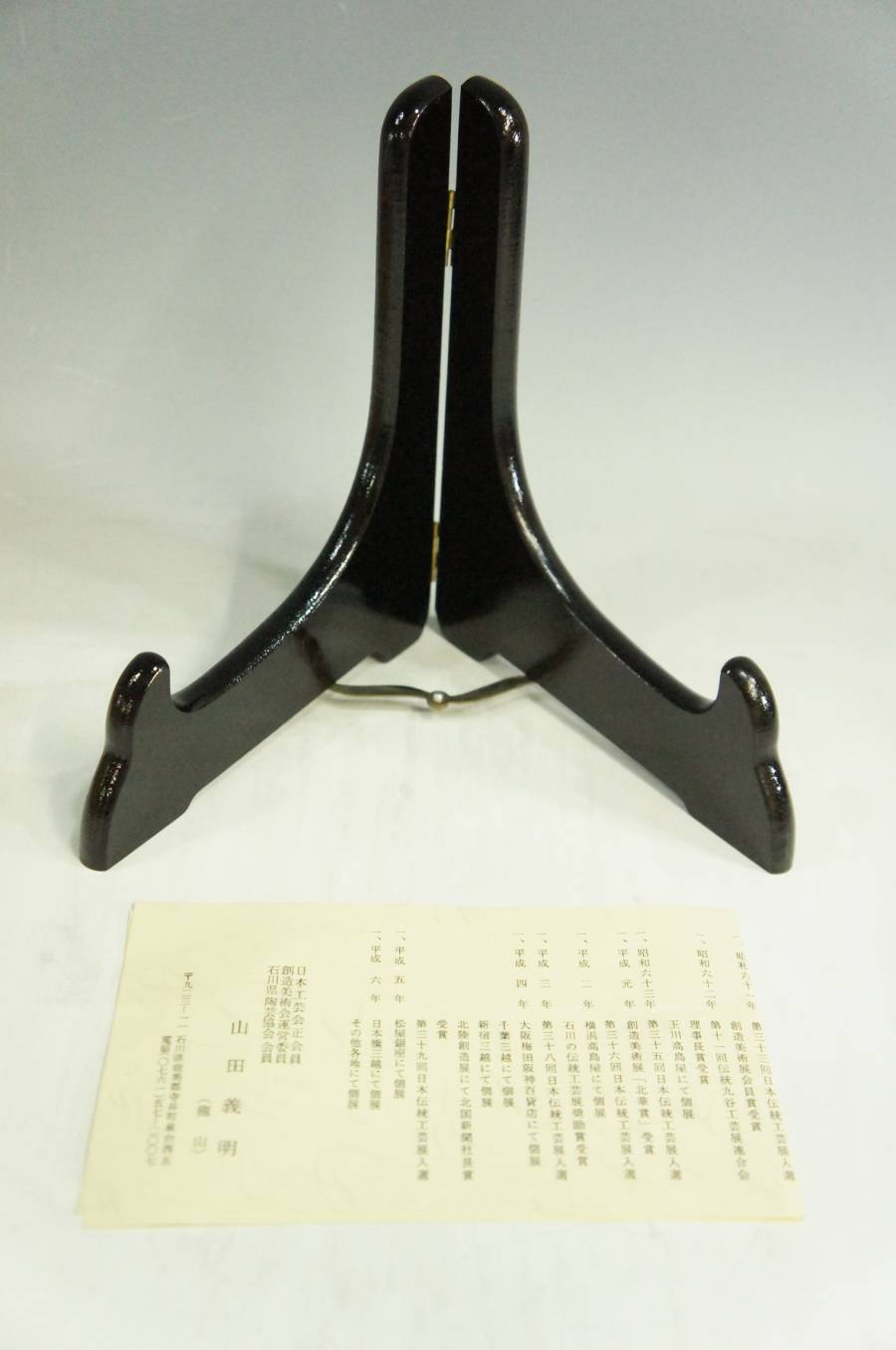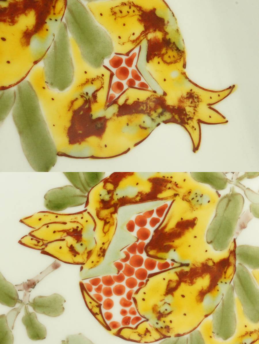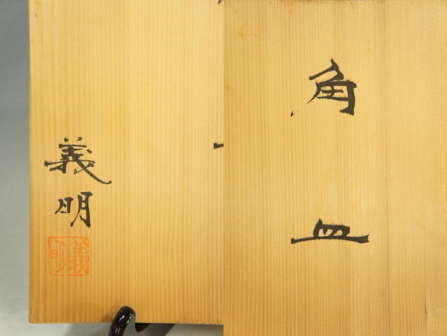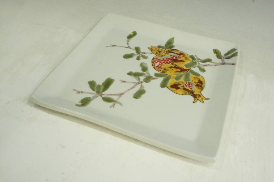 ●九谷焼 義明窯 山田義明 龍山 角皿 色絵 柘榴図 状態良好 共箱 皿立て付 状態良好