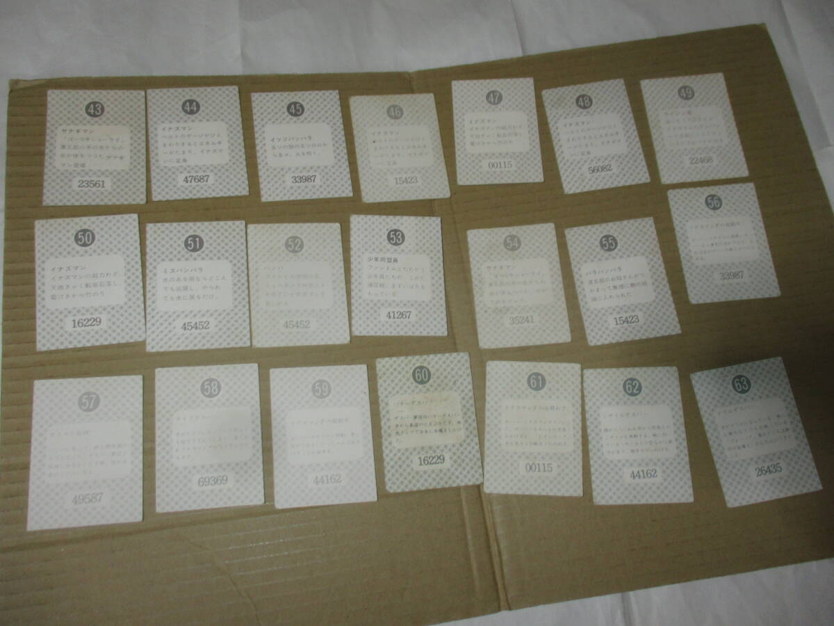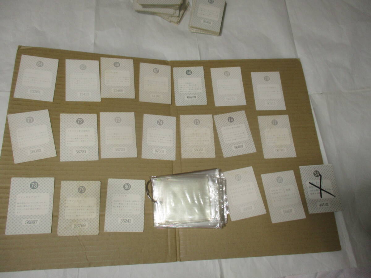| 商品説明 | 1-80と希少番号83,105とカードホルダーです。 カードホルダーは表紙が片側しかありませんが仕様のようです。 カードはおおむね良好ですが何種か角の傷みや裏の汚れがあります。 22,40は傷みが多いです。83と105は美品です。 発送方法はレターパックのみです。定形外郵便などほかの方法は対応できません。 落札決定後要望があった場合は落札者都合による取り消し処置を執りますので ご了承願います。 |
