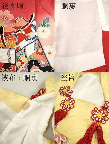 | 【祝着】 身丈 70cm(肩から) 裄丈 39cm(肩上げ 2.5cm) 袖丈 54cm 縫込み 3cm 袖幅 28cm 前幅 15cm 後幅 16.5cm 着物縫いこみ 内揚げ 0cm (腰上げ 12.5cm) 裄 お袖側 約1.5cm 身頃側 約1cm 【被布】 身丈 49cm(肩から) 裄丈 11.5cm(肩上げ 0cm) 《 サイズについてはこちら 》 |