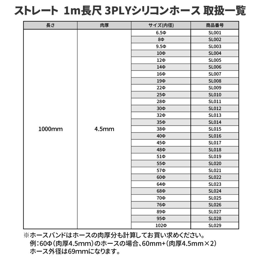 ■商品コード SL005 ■形状 汎用3層構造シリコンホース 長尺ストレート ■数量 数量1で1本の入札 ■内径 12Φ(mm) 外径=内径+4.5mm×2 ■長さ 1000mm ■特徴 耐圧・耐候・耐熱性に優れたシリコンホースで、純正ゴムホースと 交換するだけで、エンジンパフォーマンスを向上させます。 肉厚な3層構造のため、内径変化を起こしにくく、耐圧性にも 非常に優れています。 ■耐熱温度 -40℃~210℃ ■注意事項 ホースバンドおよび取付け説明書等は付属しておりません。 純正品と比べ、厚みがありますので純正のホースバンドは 使用できない場合がございます。 その場合はホースバンドを別途ご用意していただく必要があります。 耐油ホースではありません。オイルラインやフューエルホースには 絶対に使用しないで下さい。 ■関連商品 ストレート シリコンホース クッション シリコンホース 異径ストレート シリコンホース 45°エルボ シリコンホース 90°エルボ シリコンホース 135°エルボ シリコンホース 1m長尺ストレート シリコンホース 切り売り シリコンホース シリコンキャップ ホースバンド |