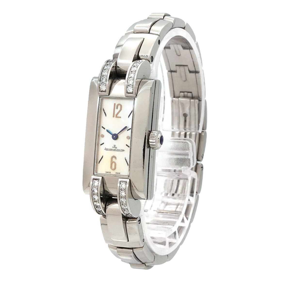 | 商品概要 | ジャガールクルトから上下のラグには合計24個のダイヤモンドがセッティングされており、文字盤にはシェルを使用た大変上品なデザインの『イデアル』です。大人のエレガントさ醸し出す上品な逸品です。 |