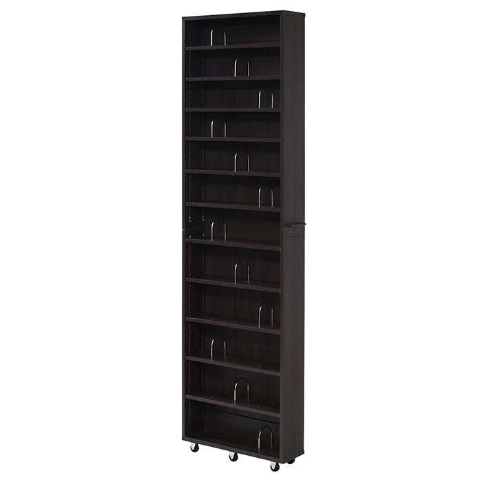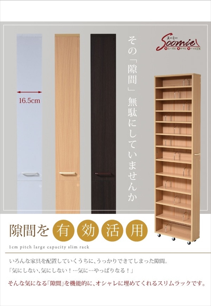 | 幅16.5cmの隙間を埋めてスッキリ収納。 たくさん増えて置き場に悩む、本やメディア類もこれ一台にまとめることができます。 棚板は11枚付いているので、12段の棚を作ることができ、収納の自由度が高い隙間ラック。 |