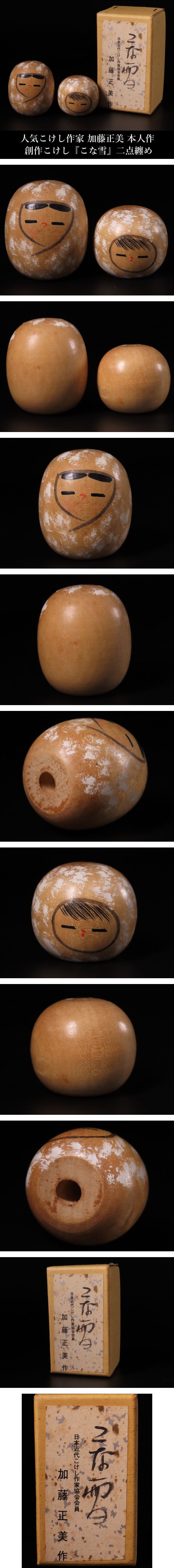 【ONE'S】人気こけし作家 加藤正美 本人作 創作こけし 『こな雪』 高4.7cm・3.3cm 2点まとめ 小芥子 伝統こけし 郷土玩具 伝統工芸 共箱付 | |||
