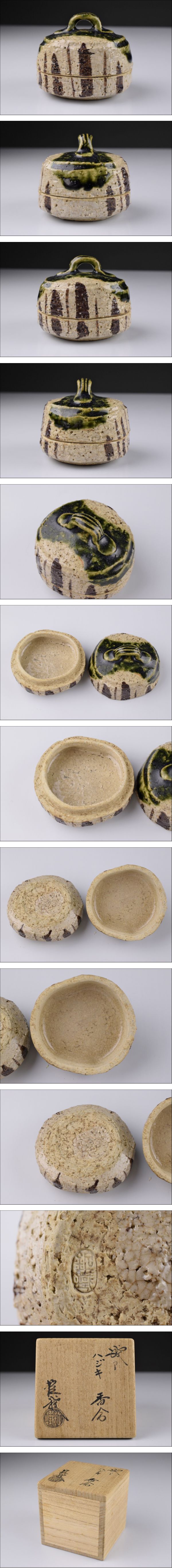 品 名:山口錠鉄 織部 香合 共箱 茶道具 香道具 寸 法:高さ 4.9㎝ 幅 5.9㎝×5.7㎝ 総重量:94g 状 態:傷など無く良品でございます。 | |||