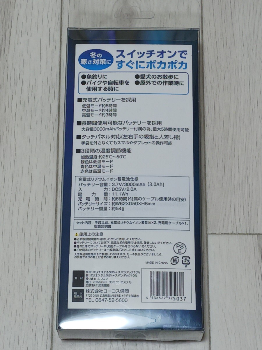 私が店頭で新品で仕入れた商品になります、よろしくお願いいたします。 写真で白く 商品が写ってるように見えますが箱のキズスレになります、商品自体は新品未開封 未使用の物です。 電熱式防寒手袋 充電式バッテリーを採用した電熱式防寒手袋です。加熱温度は約25℃~50℃で高温(赤色:約3時間)、中温(青色:約4時間)、低温(緑色:約5時間)に調節可能です。 バッテリー用ファスナーポケット 手首部分にバッテリーを入れられるファスナーポケットが付いています。 タッチパネル対応 手袋をつけたままでスマートフォンの操作が可能です。(人差し指・親指) すべり止め付き 手のひらにすべり止めがついているのでグリップ性があります 面ファスナーアジャスター仕様 手首部分は着脱しやすい面ファスナーアジャスター仕様となっています。 |