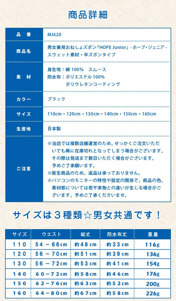 | 男女兼用 おねしょズボン ホープ・ジュニア(MJ620) 110cm ブラック 日本製 3点 | |