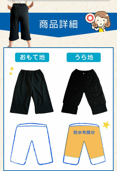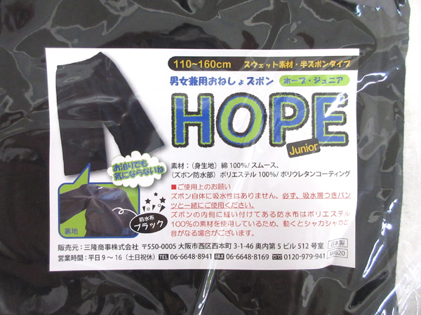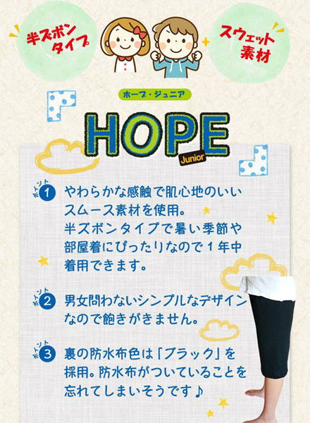 | 内 容 | ■男女兼用 おねしょズボン ホープ・ジュニア(MJ620) ■サイズ:110cm ■カラー:ブラック ■日本製 半ズボンタイプで1年中お使いいただける スウェット素材で肌触りもとっても良いです。 ズボンは防水性がありますが 吸水性はありませんので、 おねしょパンツと一緒にお使い頂くことで しっかりおねしょ対策ができ大好評です。 男の子も女の子も着用できてとっても便利なおねしょパンツ! |