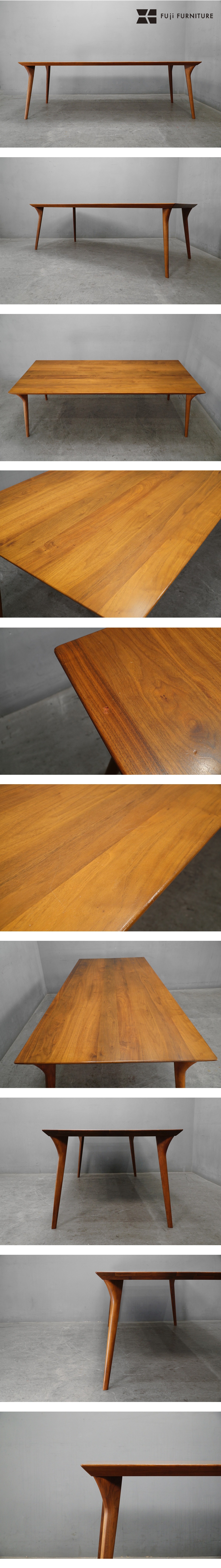 ◇FUJI FURNITURE(冨士ファニチア)の「Koti」ウォールナット無垢材 ダイニングテーブルです。 天板の厚み45㎜と厚いに関わらず、45度の面を取る事ですっきりとした印象をを与え、エッジ先はR5程度の丸い面をとることで触り心地と安全性を考慮しています。テーブルに必要な要素だけを残すことで、マテリアの質感をより美しくみせてくれます。また脚から天板に繋がるような一体感は、細かな細部の拘りから成り立っています。天板のエッジの角度の流れに合わせて脚部のラインも内側に入り流れるように外へと脚が伸びる。一見して造形的でありながらも実は安定性に配慮されたデザインになっています。 これらの拘りが彫刻のように美しく一体感のあるデザインを生んでいます。 参考までにブランドサイト(FUJI FURNITURE)をご覧ください。 参考新品価格(約):386,100円 |