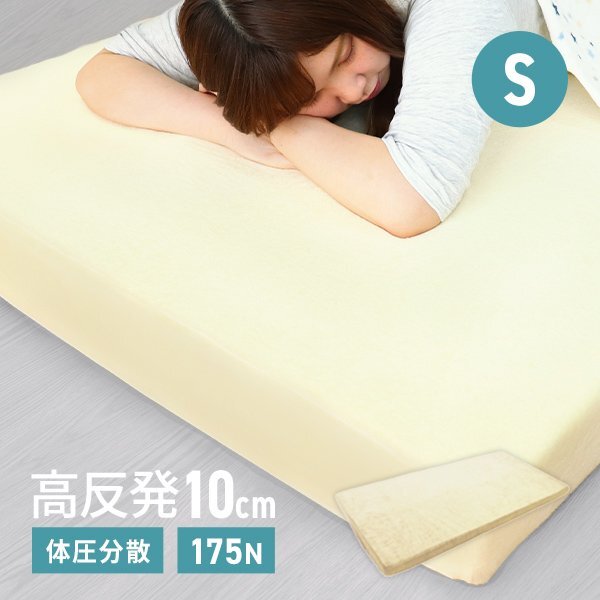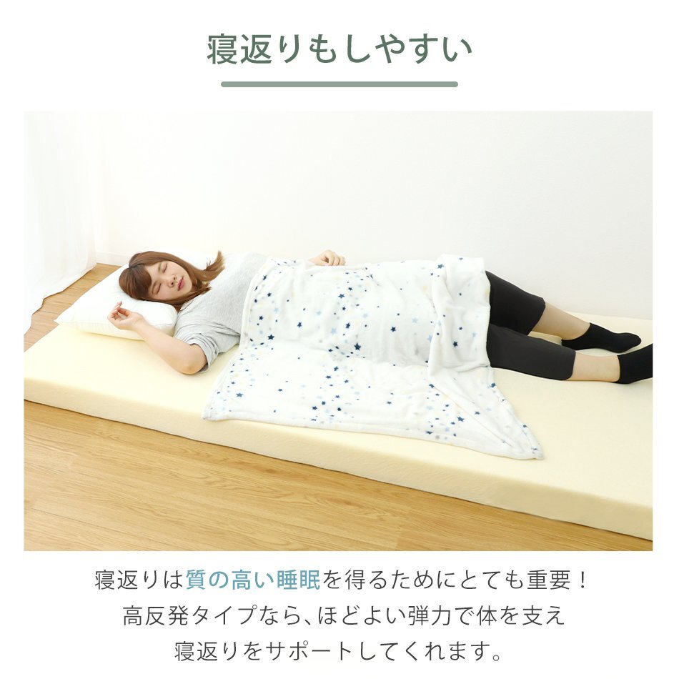 適度な硬さで身体をしっかり支える、高反発マットレスです。 柔らかいマットレスとは違い、身体の沈み込みを軽減した腰に優しい寝心地です。 高反発マットレスのウレタンフォームは弾性が高く、適度な硬さで身体を支えるので、底つき感もなくへたりにくいマットレスです。 寝返りが多い方や仰向けに寝ることが多い方におススメです。 取り外しやすいL字ファスナー付き洗えるカバーが付属しています! 【商品仕様】 カラー:ベージュ サイズ(約):幅97cm×長さ195cm×厚み10cm(シングルサイズ) 梱包サイズ(約):53.3×36×36.5cm 重量(約):7kg 素材:高反発ウレタン(密度27D(27kg/m3)) 、パイル生地 他 硬さ:175ニュートン 【注意事項】 ・圧縮梱包されたままの状態で長期間保管した場合、マットレスが復元できなくなってしまいます。商品到着後、すぐ圧縮から開放をして頂くようにお願いいたします。 ・マットレスは約1~2日で復元します。気温や温度により3~14日かかる場合もあります。 ・製品の臭いが気になりましたら、風通しの良いところで脱臭してください。この臭いは素材のウレタンによるもので無害です。臭いに敏感な方は十分ご検討の上、ご購入をお願いいたします。 ・マットの硬さは温度によって変わってきます。また、硬さの感じ方には個人差があります。 ・カバーは取り外して洗濯ができますが、マットレス本体は洗濯しないでください。 ・商品は、モニターによって色合いが異なって見える場合があります。 ・仕様・デザインは改良のため予告なく変更することがあります。 |