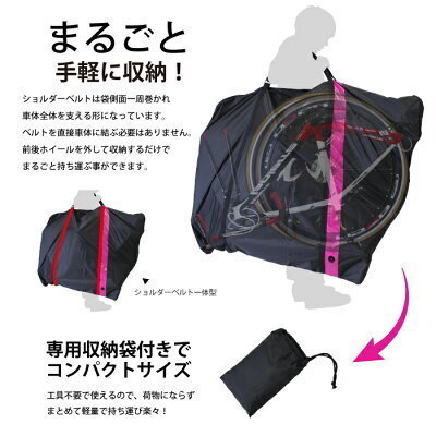 | ロードバイク、クロスバイク等を手軽に持ち運べるコンパクトな肩掛け輪行袋 ・軽量コンパクトで荷物を圧迫せず持ち運ぶ事ができます。 ・前後ホイールを取り外しフレームを逆さまにしてハンドルを切り収納 両サイドに外したホイールを収納してファスナーを閉じるだけ。 ・ショルダーベルトが収納袋一体となっているので車体に取り付け不要 下からしっかりと車体を支えて安定して運べます。 サイズ:高さ100~114 x長さ88~100 cm 重量:320g 材質:210Dナイロンオックス 付属:輪行袋、専用収納袋 《ご注意》 ・商品は入荷によりキズがある場合があります。 保証対象外になりますのでご了承お願い致します。 ・傷や細かい汚れが気になる方や神経質な方はご購入をご遠慮ください。 ・ディスプレイ環境により実物と色が異なる場合が有ります。 ・入荷時期により予告無く一部仕様変更する場合が有ります。 ・車種、サイズによっては収納できない場合があります。 サイズをご確認の上ご購入下さい。 | |