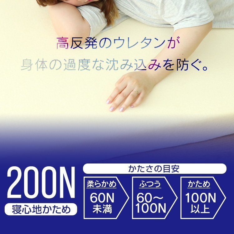 高密度30D!こだわりの硬さ200N! 厚みたっぷり10cm! 適度な硬さで身体をしっかり支える、高反発マットレスです。 柔らかいマットレスとは違い、身体の沈み込みを軽減した腰に優しい寝心地です。 高反発マットレスのウレタンフォームは弾性が高く、適度な硬さで身体を支えるので、底つき感もなくへたりにくいマットレスです。 寝返りが多い方や仰向けに寝ることが多い方におススメです。 取り外しやすいL字ファスナー付き洗えるカバーが付属しています! 【商品仕様】 カラー:ベージュ サイズ(約):幅140cm×長さ195cm×厚み10cm(ダブルサイズ) 梱包サイズ(約):75×36.4×36.4cm 重量(約):9.9kg 素材:高反発ウレタン(密度30D(30kg/m3)) 、パイル生地 他 硬さ:200ニュートン ※耐熱仕様ではございませんので、電気毛布との併用はおやめください。 (マットレス シングル セミダブル ダブル 高反発 低反発 高反発マットレス 低反発マットレス 4cm 8cm 10cm シングル 高反発マット 低反発マット マット ベットマット ベッド 敷き布団 洗える カバー 寝具 人気 おすすめ ) |