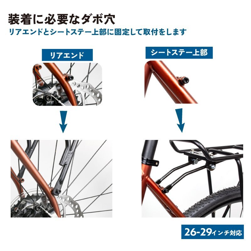 自転車荷台、自転車用リアキャリアを装着して荷物を沢山自転車に積載できる! 自転車通勤・通学やツーリング、旅行、お買物に最適なリアキャリアです。 キャリアを付ける事で背中に汗を掻いて不快な思いをしたり、長時間背負い体に負担を掛ける事も無くなります。 背面には台座があるのでライトなど取り付ける事も可能です。 リアエンドのダボ穴と2点で固定します。 [耐久性・軽量] 軽量性、強度、耐食性に優れるアルミ素材を採用。また通常の塗装に比べ軽量性、耐久性に優れるアノダイズド(アルマイト)塗装を採用し さらに強化。 [超耐荷重] 最大耐荷重約25kg!重い荷物を積むことが可能。自転車通勤や自転車通学に最適です。 ツーリングで荷物が増えても安心。 [簡単装着] 日本語説明書入りで装着は簡単に行えます。 装着に必要なダボ穴等をご購入前にご確認お願いします。 商品内容リアキャリア、説明書(※工具は付属していません) サイズ長さ39×幅13.4cm、高さ38cm 最大耐荷約25kg 材質アルミニウム合金 ※装着に必要なダボ穴等をご購入前にご確認お願いします。 | |