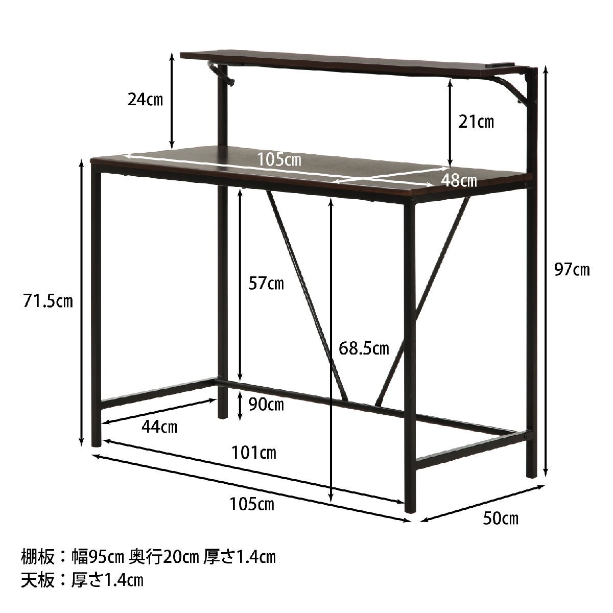 | サイズ | 全体:幅1050 × 奥行500 × 高さ970mm 耐荷重(天板):20kg 天板サイズ:1050x480x14mm 上棚サイズ:950x200x14mm ※サイズ詳細はサイズ画像をご参照ください。 |