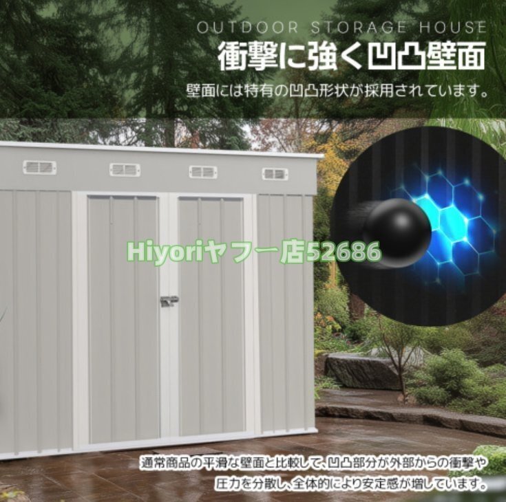 雨が降ると、屋根にたまることなく、斜面と凹槽を経由して地面に流れ落ちます。これにより、物置内に雨が侵入する心配がなく、内部の部品をより良く保護します。