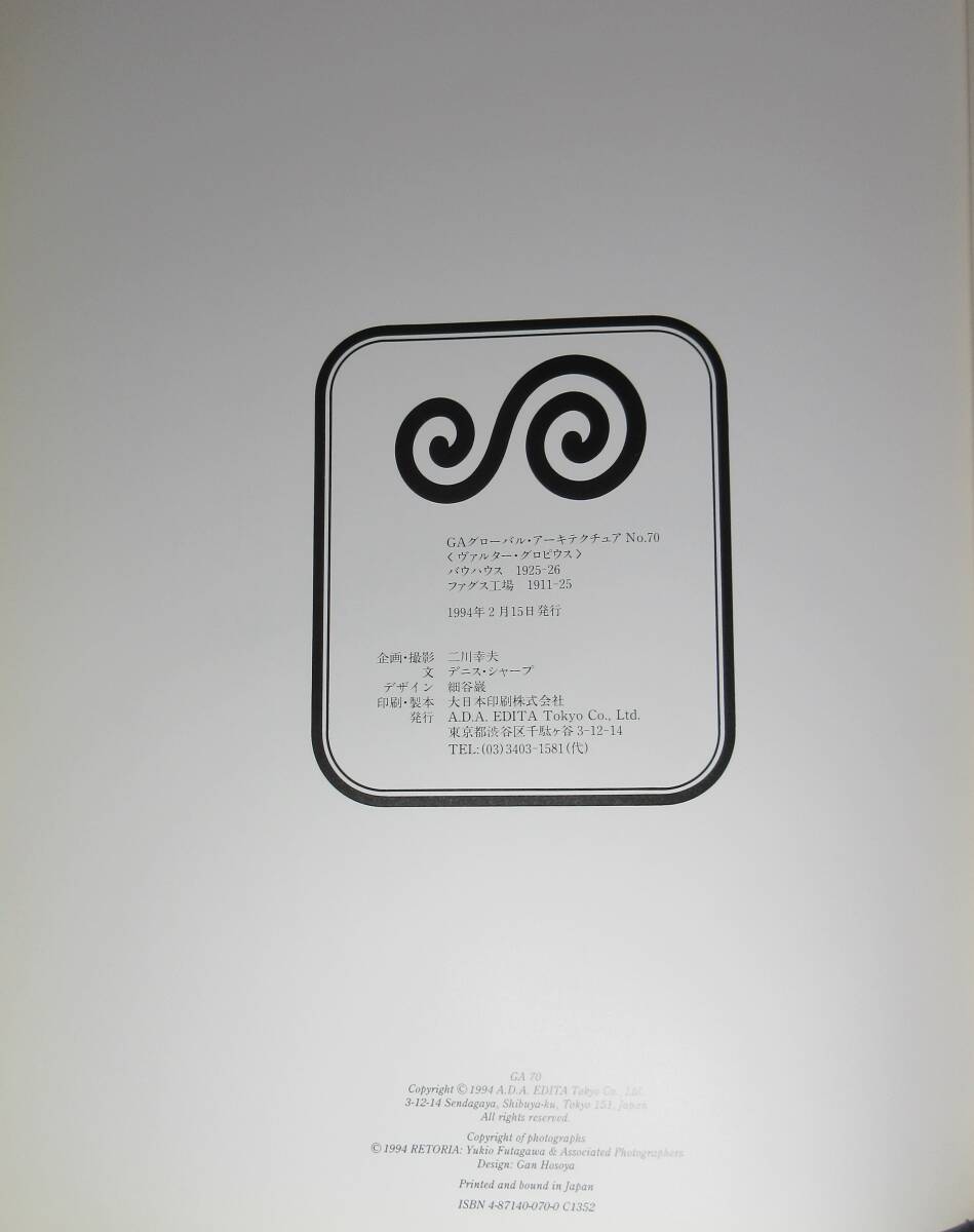 ●GA (グローバル・アーキテクチュア) No.70/ヴァルター・グロピウス、『バウハウス1925-26』『ファグス工場1911-25』、ADAエディタトーキョー刊・1994年・初版、約36.5×25.5cm、企画・撮影:二川幸夫