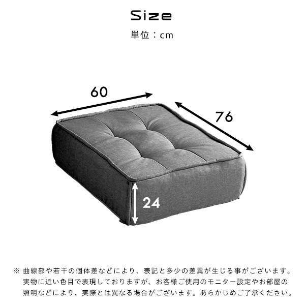 【カラー】 ベージュ、ブルー、グレー、ライトブルー、イエロー 【サイズ】 W60xD76xH24cm 【重量】 5.7kg 【素材】 側生地:ポリエステル100% 中身:ウレタンフォーム、ポケットコイルスプリング 【梱包】 サイズ:75x60x25cm、重量:6.5kg 【完成品】 届いて直ぐ使えます。 【ご注意】 ・サイズ、重量は概算です。 ・商品カラーはご使用のモニターによって実際の明るさや色と異なって見える場合がございます。 |