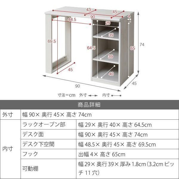 | 【カラー】 ナチュラル、ホワイト 【サイズ】 <外寸> 幅90×奥行45×高さ74cm <内寸> ラックオープン部:幅29×奥行40×高さ64.5cm デスク面:幅90×奥行45×高さ74cm デスク下空間:幅48.5×奥行45×高さ69.5cm フック:出幅4×高さ65cm 可動棚:幅29×奥行39×厚み1.8cm(3.2cmピッチ11穴) 【材質】 本体:プリント紙化粧合板 天板:合成樹脂化粧合板(PVC) 【耐荷重】 デスク面:30kg以下 可動棚:8kg以下 【生産国】 中国 【梱包】 サイズ:96×49×13cm、重量:19.3kg 【その他】 ・可動棚:2枚 ・フック:2個 ・背面化粧有り 【組み立て品】 お客様による組み立てが必要です。 【ご注意】 ・サイズ、重量は概算です。 ・商品カラーはご使用のモニターによって実際の明るさや色と異なって見える場合がございます。 |