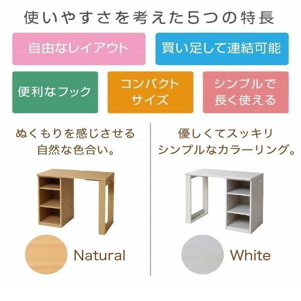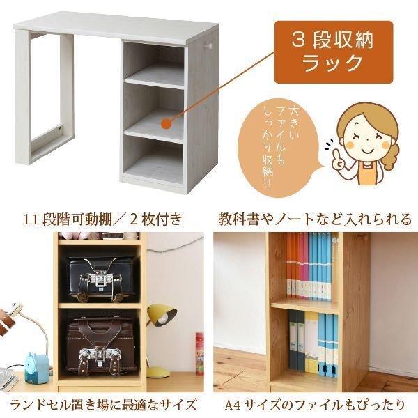 | オープンラックがついたシンプルデスクです。 高さが調節できる棚が2枚ついていて、11段階で調節可能です。 デスクにフックがついているので、 手提げ袋やトートバッグがかけられる子どもにも大人にも愛される学習机です。 |