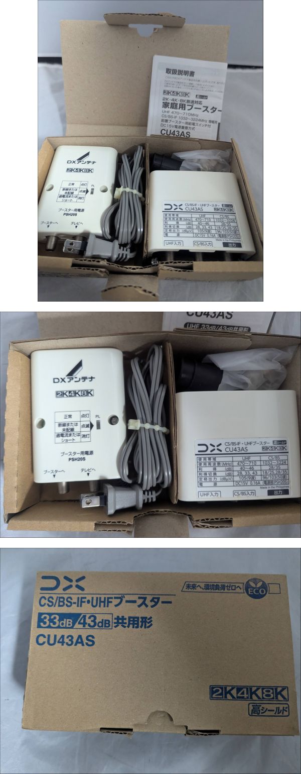 | 商品説明 | 【商品について】 ご覧いただきありがとうございます。 この度出品いたしますのは「 ●CS/BS-IF・UHFブースター 33db 43db 共用形 CU43AS DXアンテナ● 」でございます。 中古品ではございますが、ご活用いただける方にお譲りできれば幸いです。 商品の状態、付属品、寸法等につきましては、掲載写真にてご確認をお願いいたします。 補足:当方、ペットの飼育および喫煙の習慣はございません。お気にされる方はご参考ください。