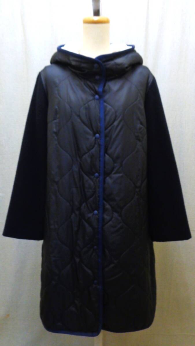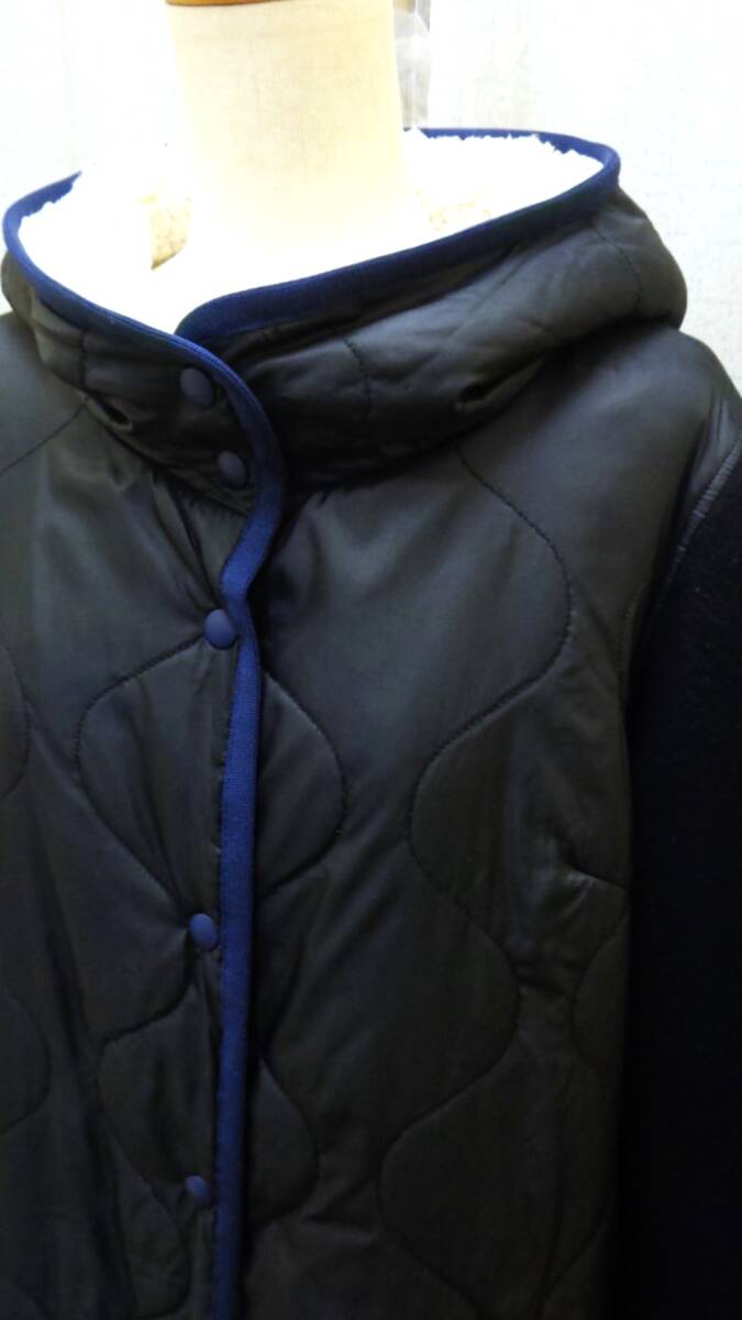 ◇◇『ピッチェン』:袖は黒に近い濃紺の圧縮ウール素材、身頃は中綿キルティング、配色デザインになったお洒落なコートです。 フード裏にはボアを使った防寒仕様、釦フロント・2ポケット付きです。