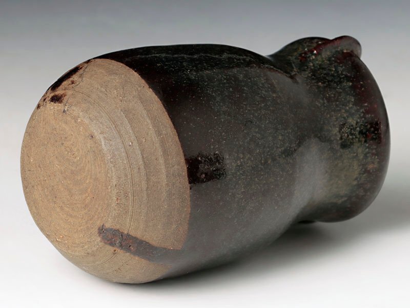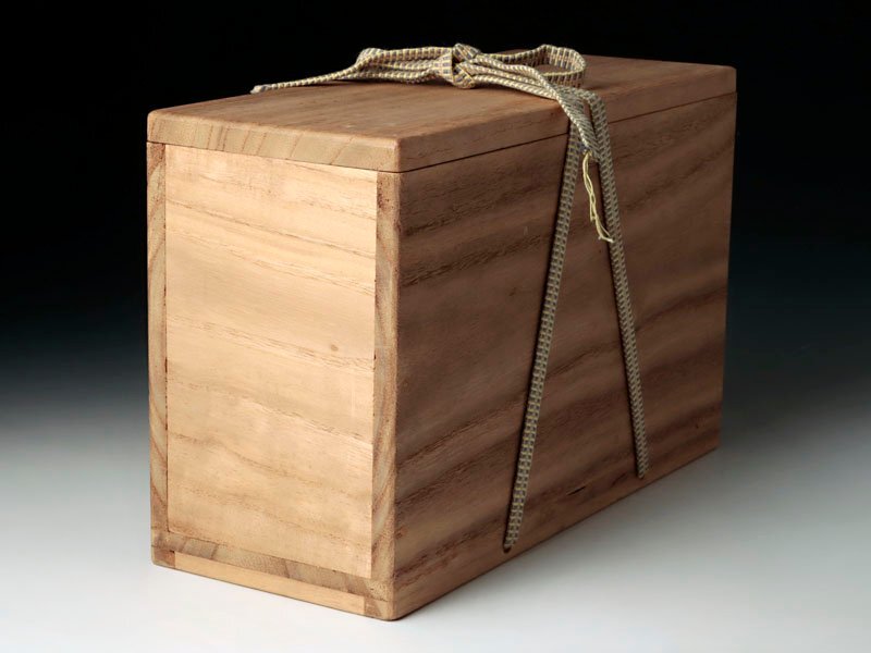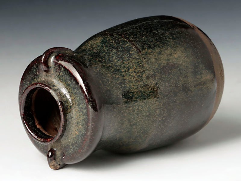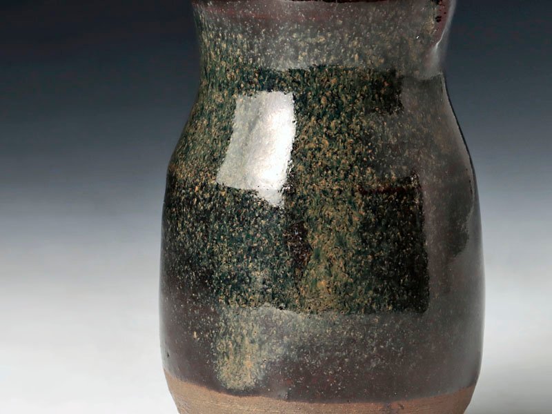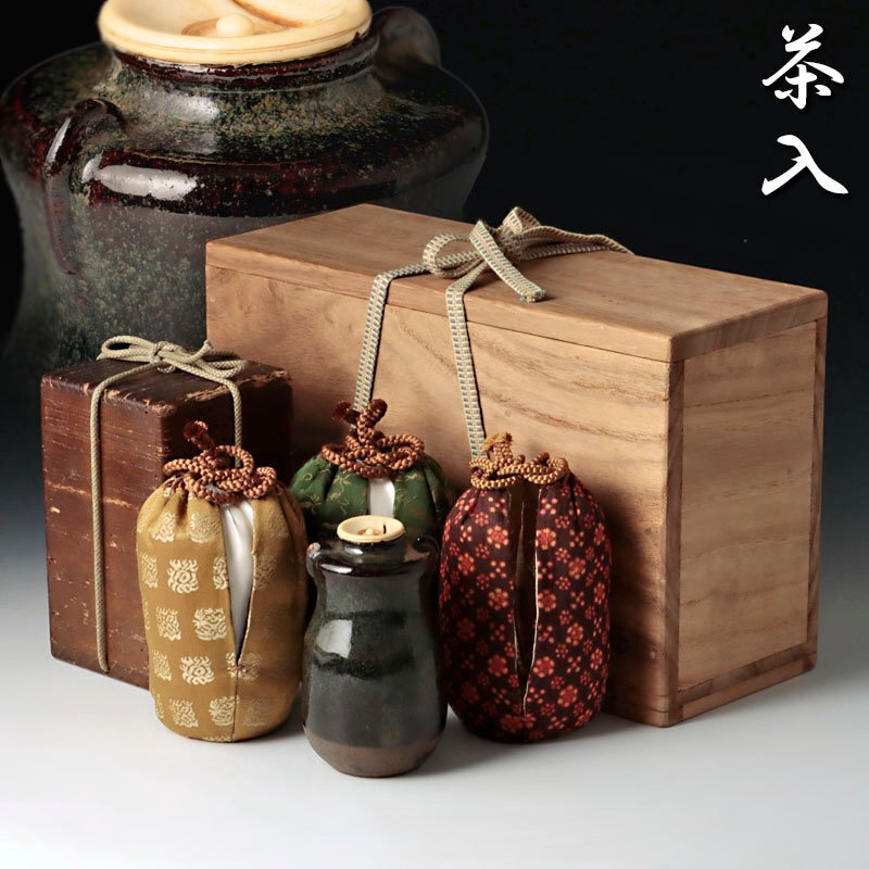 落ち着いた佇まいと深みのある景色が魅力的な耳付きの茶入です。 仕覆3枚(画像左:龍詰金襴、中央:珠光緞子、右:裂不明)付属いたします。 |