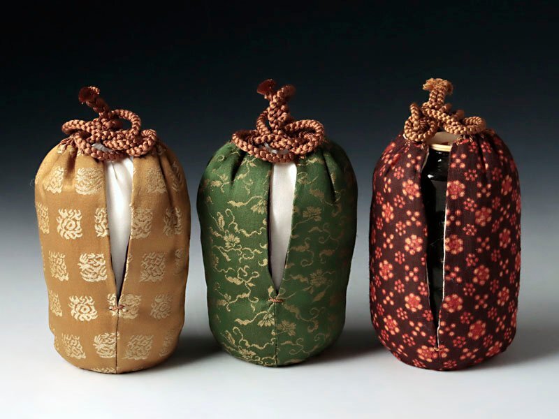 時代箱/外箱/仕覆3枚(画像左:龍詰金襴、中央:珠光緞子、右:裂不明) |