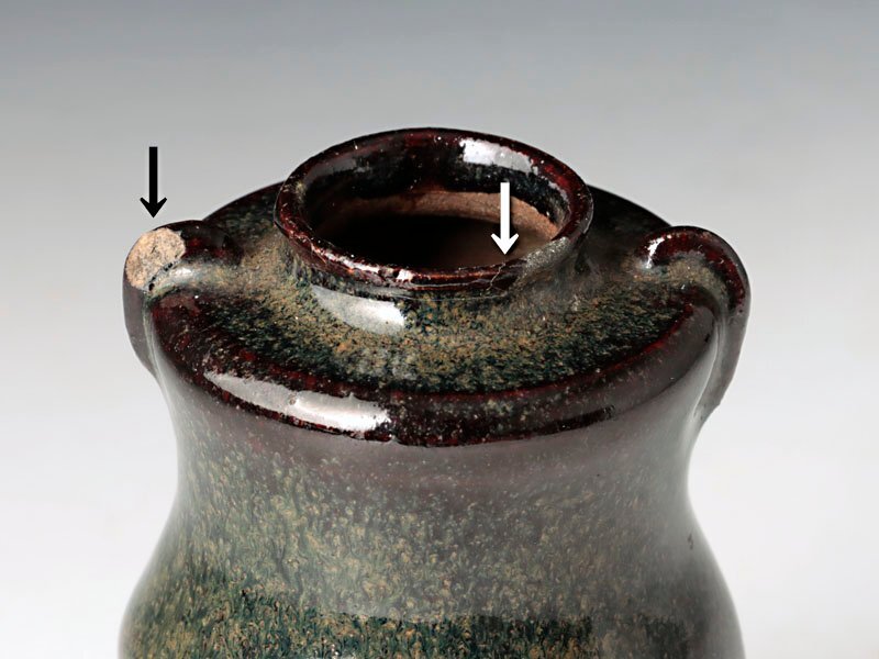 片耳にホツ、口には小さく薄いニュウあります(画像内矢印参照) |