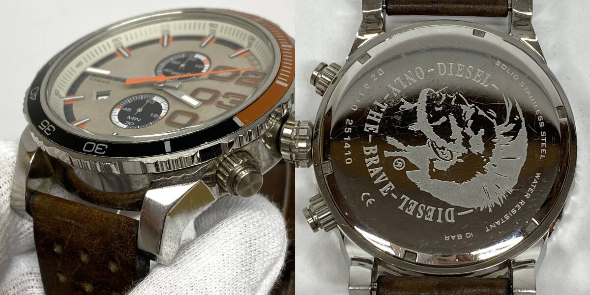 | ■商品概要 | □内容品:画像にあるもので全てです □型番:DZ4310 □状態 ・画像では分かりにくいですが、風防にキズが多数見受けられます。 ・風防の周り、側面、裏面にもキズ、スレが多数見受けられます。 ・ベルトの歪みや傷、凹み、金属部のキズやくすみ等多数のダメージがあります。 ・画像についても参考程度ですが、イメージとしてご覧ください。 ※中古品の為、電池式のものについては電池残量不明です。 お届け時に停止している可能性があります。 電池交換など消耗品の交換、メンテナンスの対応は落札者さまにてご対応くださいませ。 ※クリーニングが必要な場合は落札者様でご対応ください。 ※中古品については美品・新同品をお求めの方はご入札をお控えください。 ※ダメージの目立つ箇所はできる限り、画像を載せていいただきますが 傷み具合によっては画像にない場合もございます。 あくまで中古品という事にご理解いただける方のみご入札ください。 ※同梱は同日落札分5セットまでとさせていただいておりますのでご了承ください。 商品サイズによっては同梱できない場合もございます。 ※発送方法はオークションページにて説明している方法のみでの対応となります。 その他の発送方法には対応しておりませんので予めご了承ください。 ※上記のことをご理解・ご納得いただける方のみご入札お願いします。 ■注意事項を必ず読んだ上、ご入札お願いいたします■ |