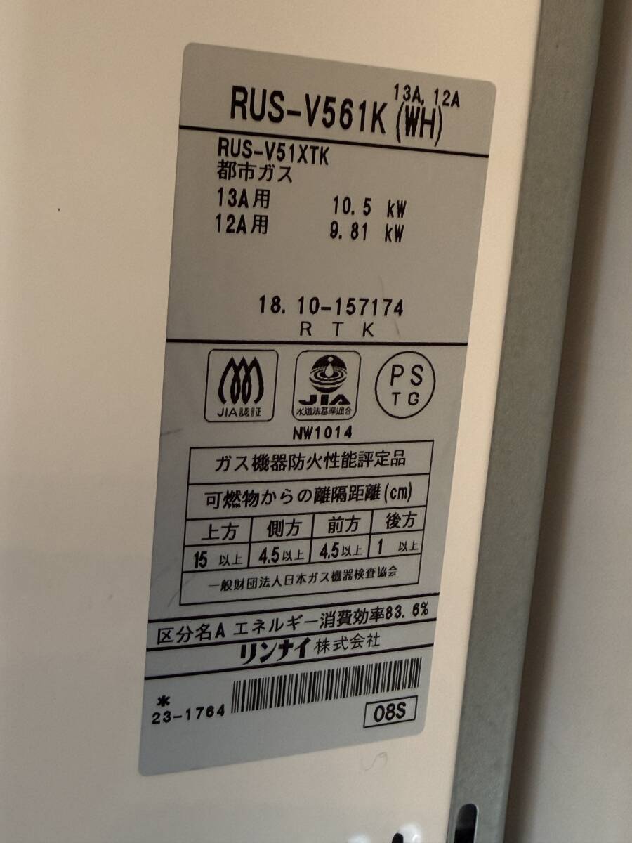 | 動作美品 リンナイ ガス瞬間湯沸器 RUS-V561 (WH) 都市ガス用 | ||