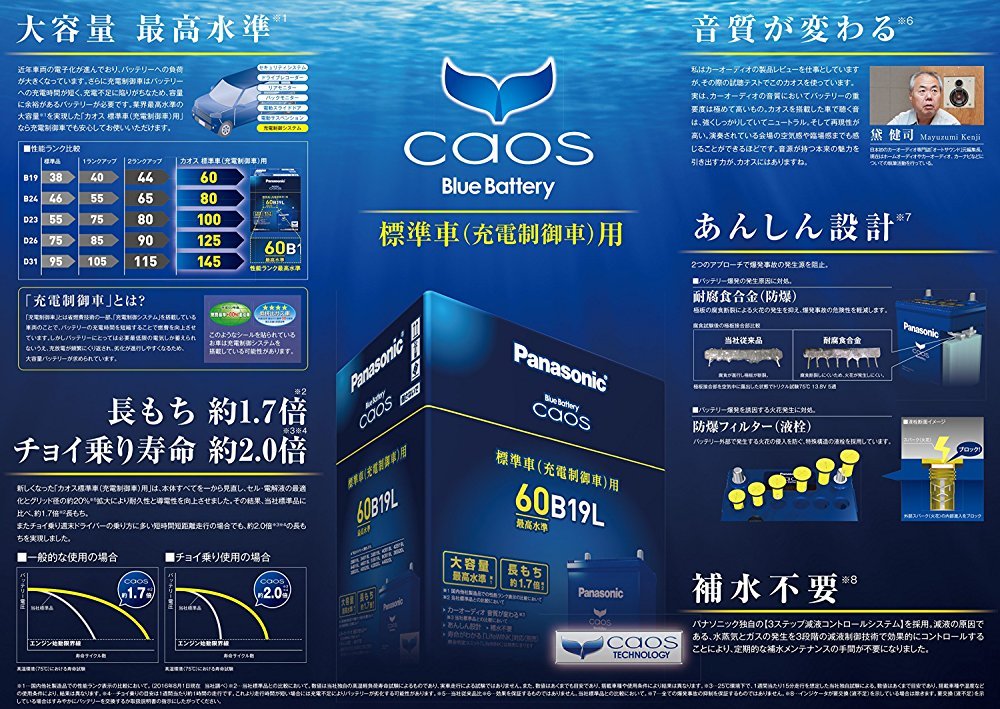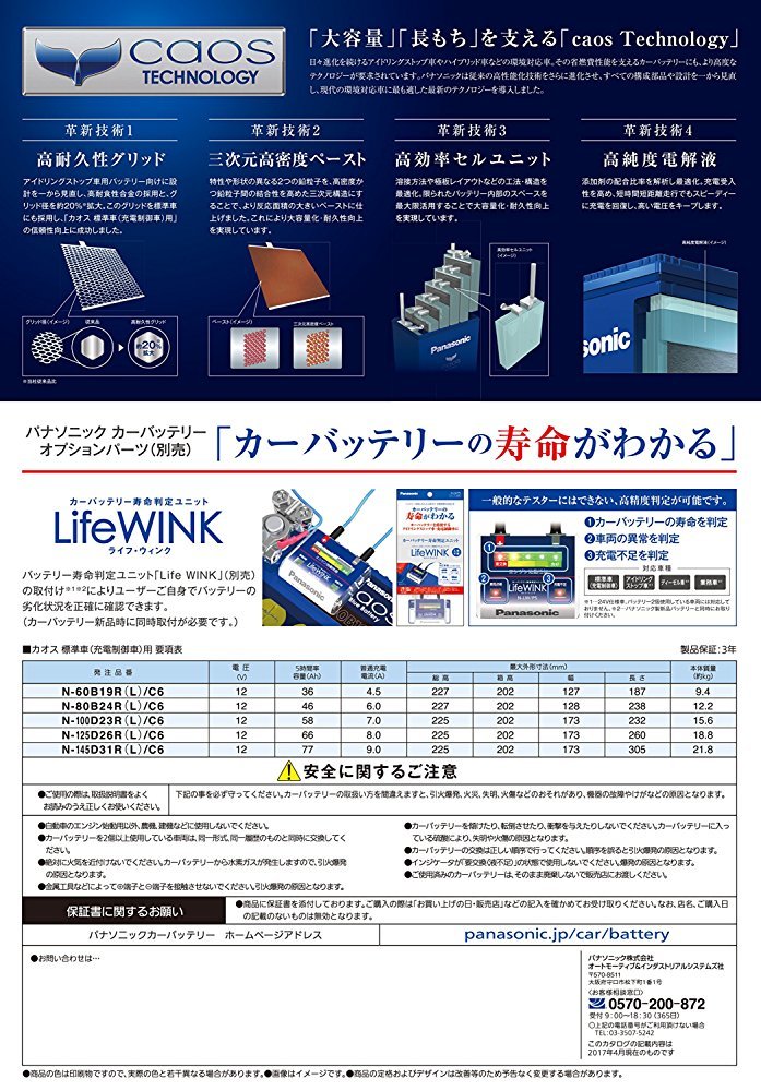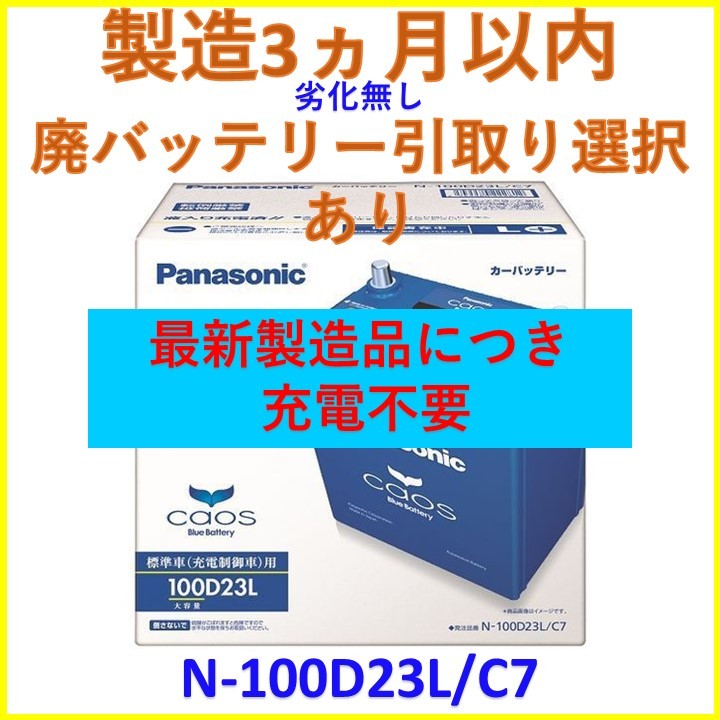 【廃バッテリー回収無料&回収分送料無料】→ 佐川の着払い伝票を付けますので同じ箱で送り返してください佐川に電話をすれば無料で家まで引き取りに来てくれます。 御希望の方は落札後に一言コメント頂ければ幸いです。 当方から → 落札者 (980円) 落札者 → 廃バッテリー指定先 (無料:出品者負担 商品同封の佐川印字済み着払い伝票使用) 2枚目画像のように現在主流の送付スタイルで送付いたします。 宅配業者もメーカーもこのスタイルで送付する事を推奨しています。 (メリットはバッテリーと一目で分かるので扱いが丁寧、送料サイズがコンパクトになるので経済的、横に倒されたり、誤って空輸扱いになり差し戻される心配が無い) 商品紹介●高速充電性能 (充電受入性) 最高水準 ・パナソニックの独自技術である「新パワフルペースト」を採用。負極版に使用されている添加剤比率を最適化することで、高速充電性能が大幅にアップ。 ・負極版に反応表面積の大きい「低抵抗カーボン」を採用し、電気抵抗を低減することで、高速充電性能(充電受入性)を向上。 ●大容量 最高水準 ・新パワフルペーストにより多くの電気を蓄えられるようになり、大容量化を実現。 ・負極版に反応表面積の大きい低抵抗カーボンを新採用することで、大容量化を実現。 ・スリムファインメッシュグリッドを採用することで、より多くの極板を格納でき、大容量化を実現。 ●軽量化 最高水準 ・パナソニック独自の軽量化技術により、グリッドの薄型化に成功し、無駄な鉛を使用しない軽量化を実現。 ●長持ち ・「MFシルバー合金」を採用で、長寿命を実現。 ●防爆設計で安全性を向上 ・液栓部分に「MF防爆液栓」を採用で、爆発事故の危険性を軽減。 ●補水不要のメンテナンスフリー ・減液の原因である水蒸気とガスの発生を3段階の減液制御技術でコントロール。定期的な補水メンテナンスが不要。 ●カーオーディオの音質が変わる ・繊細な電流を供給することで「クリアな音質」、安定した電圧を維持することで「安定した音質」を再現。 ●製品保証 3年保証 【 N-100D23L/C7 の適合車種一覧】 必ずカオスHPより車種別適合で最終確認願います。 下記表記車種でも型式により不適合の場合があります。