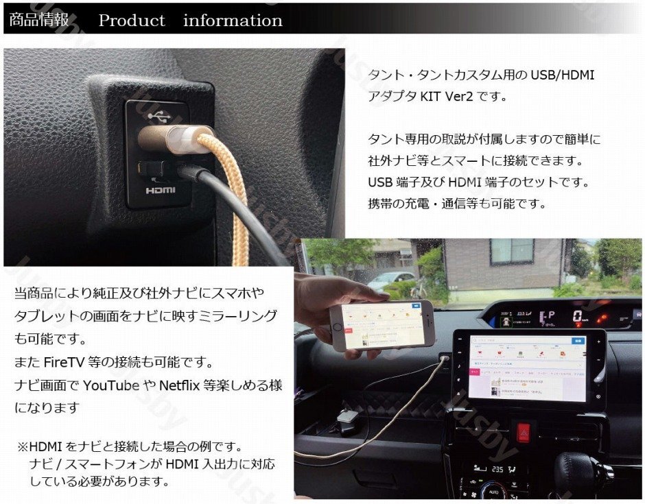| ダイハツ タント&タントカスタム専用 USB/HDMIアダプタKIT(社外ナビ用)です。 2019.7発売のタント・タントカスタム・タントファンクロス(LA650S/LA660S)専用 USB/HDMIアダプタKITです。 ・2024年4月よりVer2となり耐久性・信頼性が向上しました ・別途純正ナビ用のケーブルが付属した「純正ナビ用」も販売しています。 当商品によってタントのサービスホール部にUSB&HDMIコネクタを設置できます。 社外ナビ等と接続することによりスマートにナビと接続できます。 MHLケーブル(Android)やDigital AV Adapter(Apple)その他ミラーリング機器とと併せて使用する事により、 ナビにスマートフォンやタブレットの画面を映したりスマートフォン内の音楽再生、USBメモリーを差してナビで動画や音楽を楽しむと言った事がスマートになります。 ・USB及びHDMIをナビと接続した場合の一例です。ナビの仕様により異なる場合もあります。 商品には取り付け説明書(WEB取説)が付属しますので、DIYでの取り付けも可能です。 (ナビの取り付けができる程度の工具や知識は必要です) 製品保証を行っております。一年間は故障や不具合に対して無償保証致します。 (レビューでの不具合報告等は投稿者様が特定出来ませんのでお手数ですが直接メール等にてお申し付けください) 注意事項 当商品は社外ナビとの接続を目的としている商品となります。純正ナビのコネクタには適合しません。 ナビメーカーによっては別途接続ケーブルが必要になる場合があります。(USB&HDMI入力が接続可能なことを確認してください)) 詳しくは車両ナビの仕様をご確認下さい。 |
