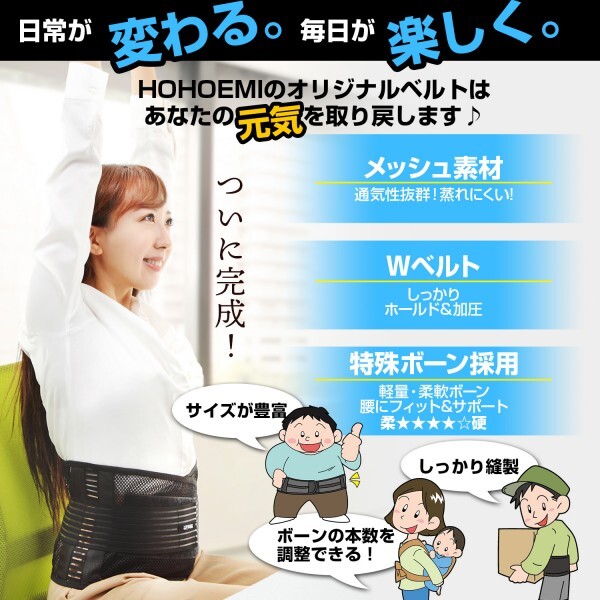数あるオークションの中から、アクセス頂きありがとうございます。 【日常が変わる!毎日が笑顔になるオリジナルベルトはあなたの元気を取り戻します!】 ・丈夫なメッシュ素材で通気性、耐久性抜群! ・こちらはMサイズのご案内になります。(豊富な8サイズを展開!) サイズ:Mサイズ 横:全長約90cm(腰周り:約66~75cmまで対応) 幅:約20.5cm 材質:ポリエステル65%・コットン35% カラー:ブラック (サイズ表も合わせてご覧くださいませ) ・Wベルトとマジックテープでしっかりホールド&加圧! ・医療用特殊樹脂ボーン採用だから驚きの軽さで、しっかりサポート! ・ボーンの本数が調節可能な為、ご自身の体調やご 使用環境に応じてホールド感の調整が可能です! 【こんな方にオススメです】 長時間のデスクワーク、立ち仕事、ヘルニアやぎっくり腰、 関節痛などの不安がある方、日常的に腰のサポートをしたい、 ウエストのシェイプアップなど、幅広く様々な方にご利用いただけます。 【特徴】 ・二段式ベルトの長さ、ボーンの間を日本人体型にリサイズしました。 ・ボーンが最大5本内蔵でき自由に取り出せるので5→4本など数を変えて 体調やご使用環境に応じてお使いになれます。 ・丈夫なメッシュ素材を採用しているので、通気性はもちろん耐久性にも優れています。 ・洗濯機で洗えるのでお手入れが楽! 【特典もついてくる】 ・オリジナル収納ポーチが付属! ・購入者だけの特典漫画で解説日本語説明書付き! ・100%安全保証!サイズ交換ももちろんOKです。 ※3Dボーンを装着しての激しい動きには向いておりません。ご注意願います。