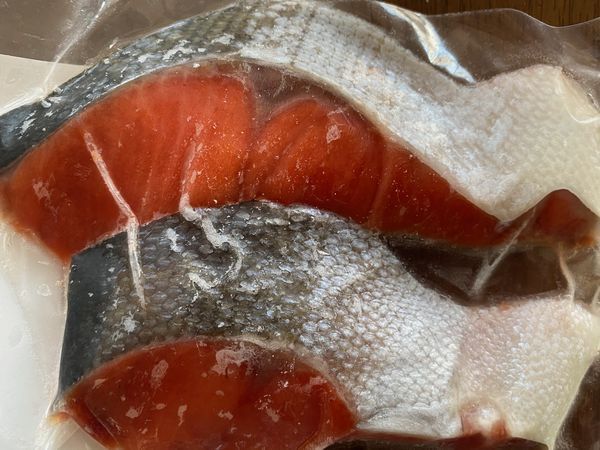 | こちらの紅鮭は写真のように〔切り身〕の状態で届きますのであとは焼くだけで簡単に調理できますよ(・∇・) |